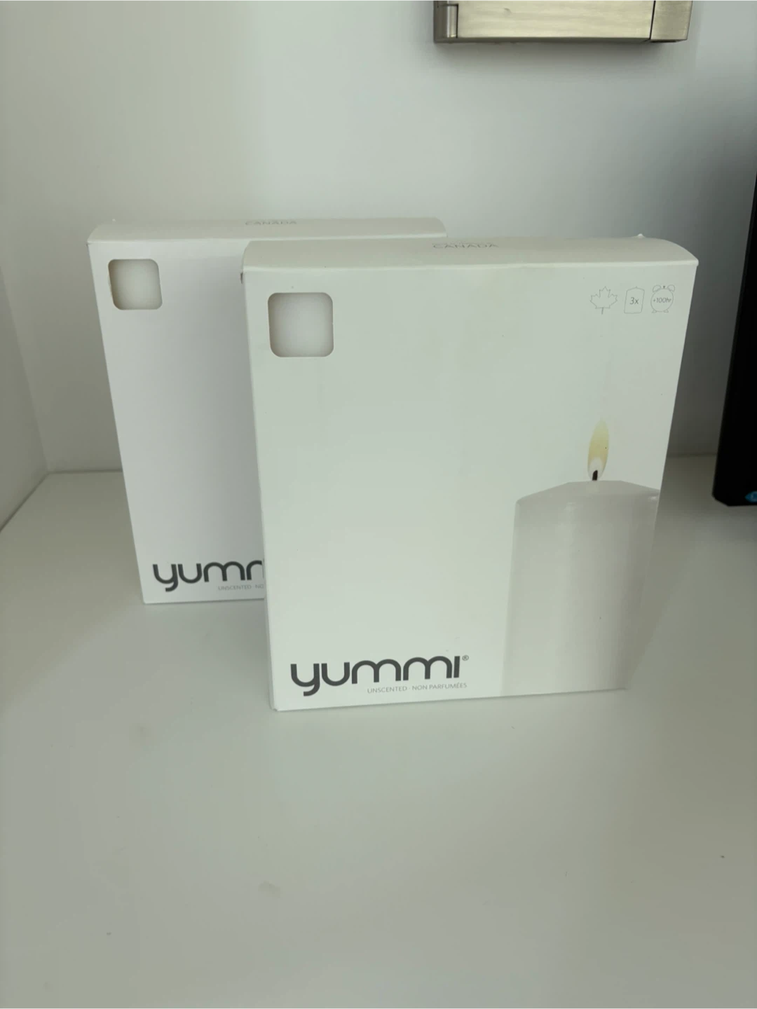 Selling two brand new sets of Yummi pillar candles, 6 candles in total! They are still in their original packaging. Each candle burns clean and has a pure cotton braided wick. They are made of fully refined paraffin and have a long-lasting formula. See last picture for stats and dimensions. Original price $34+tax x2 = $76, selling both sets for $50