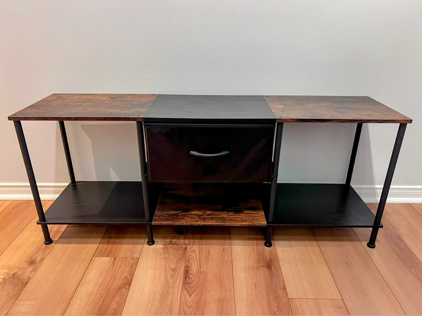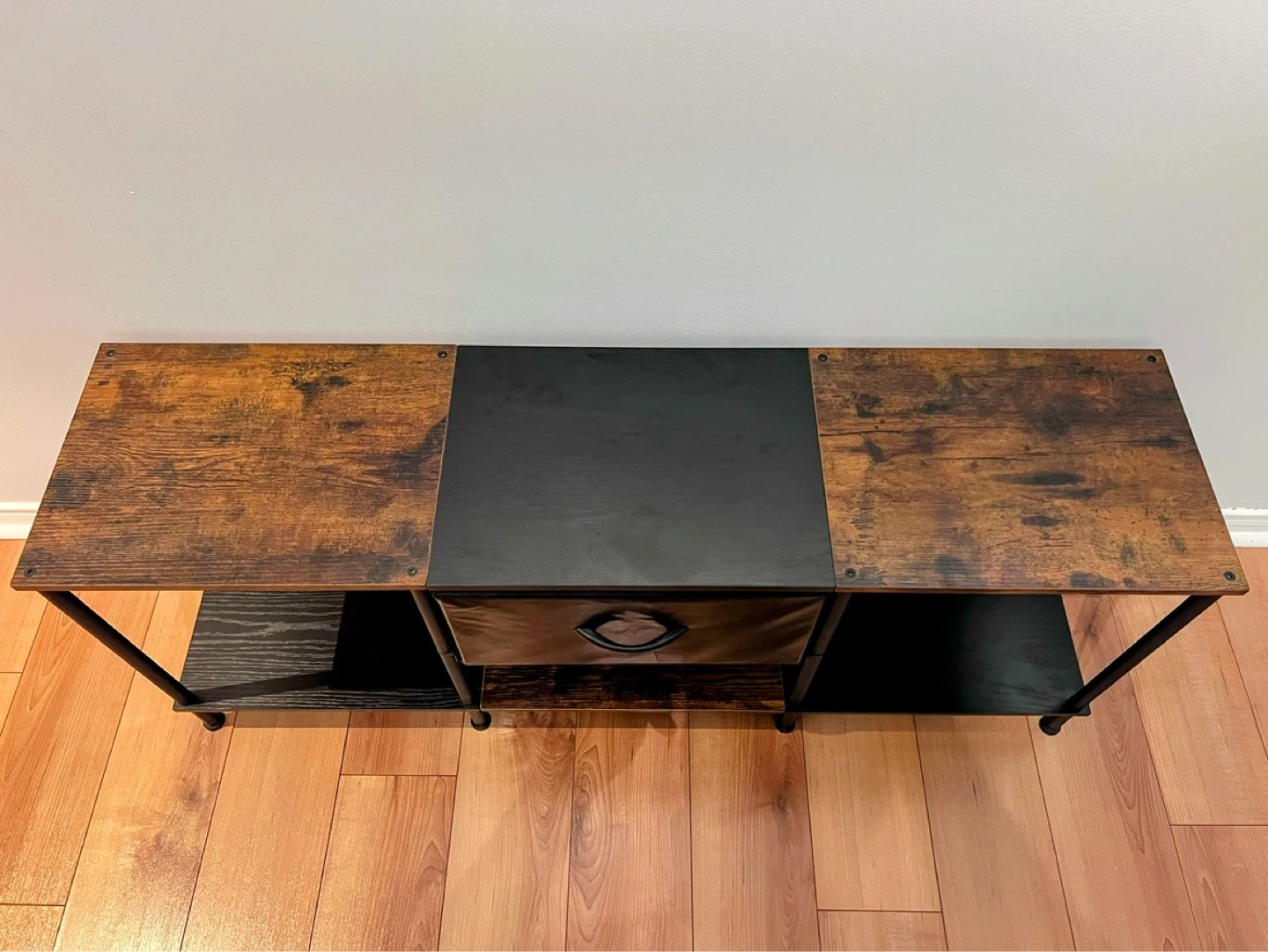 Sturdy and stylish TV stand with a modern industrial look. Features a black metal frame with wood-finish surfaces, a centre drawer for storage, and open shelving on both sides—great for media devices, books, or décor.