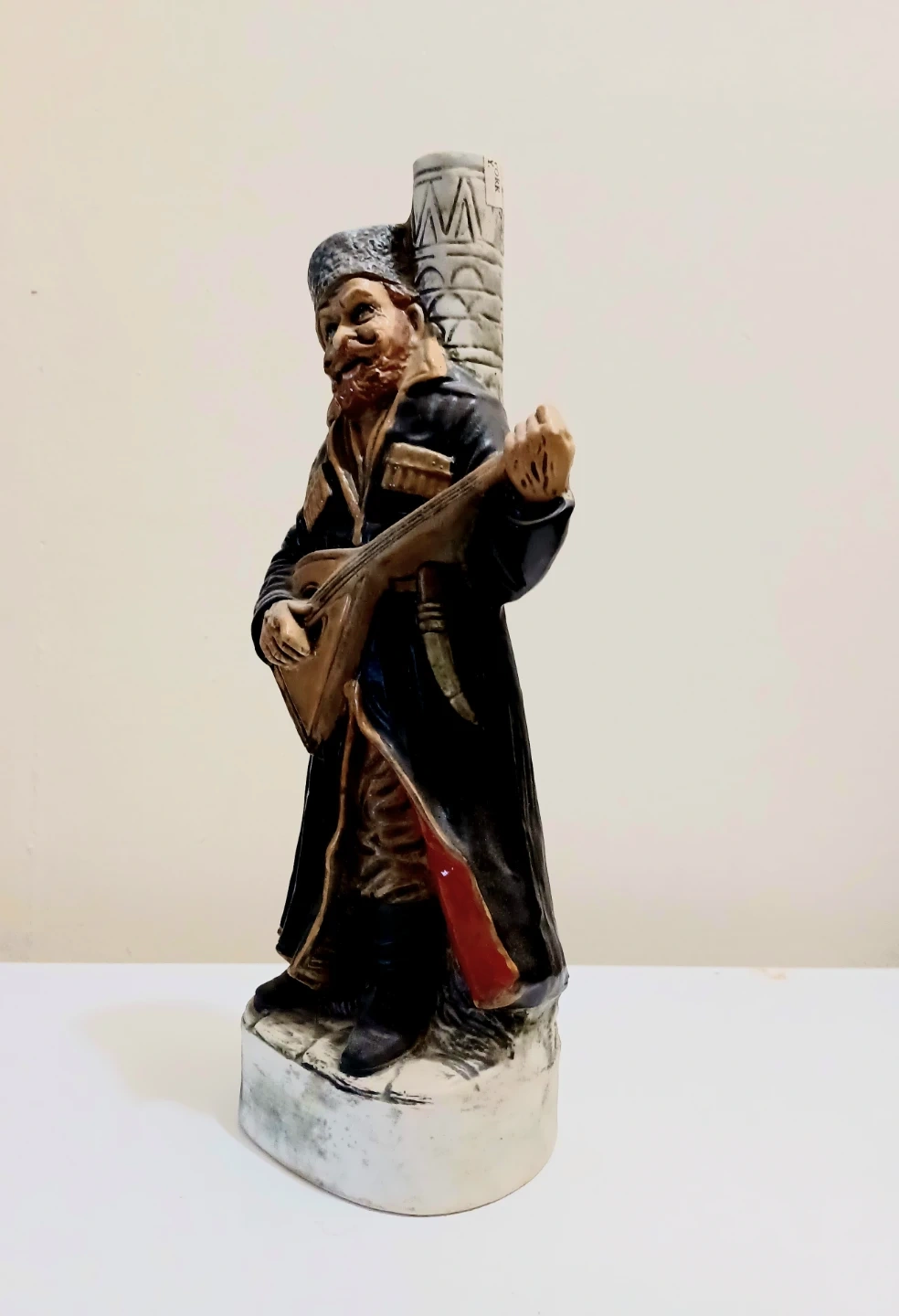 Unique, Vintage 1978, Hand Painted Russian Cossack Playing Balalaika Textured Ceramic Figurine Decanter , showcasing intricate details and craftsmanship. Made in Italy. About 12.50 inches Tall . Collectible Figurine