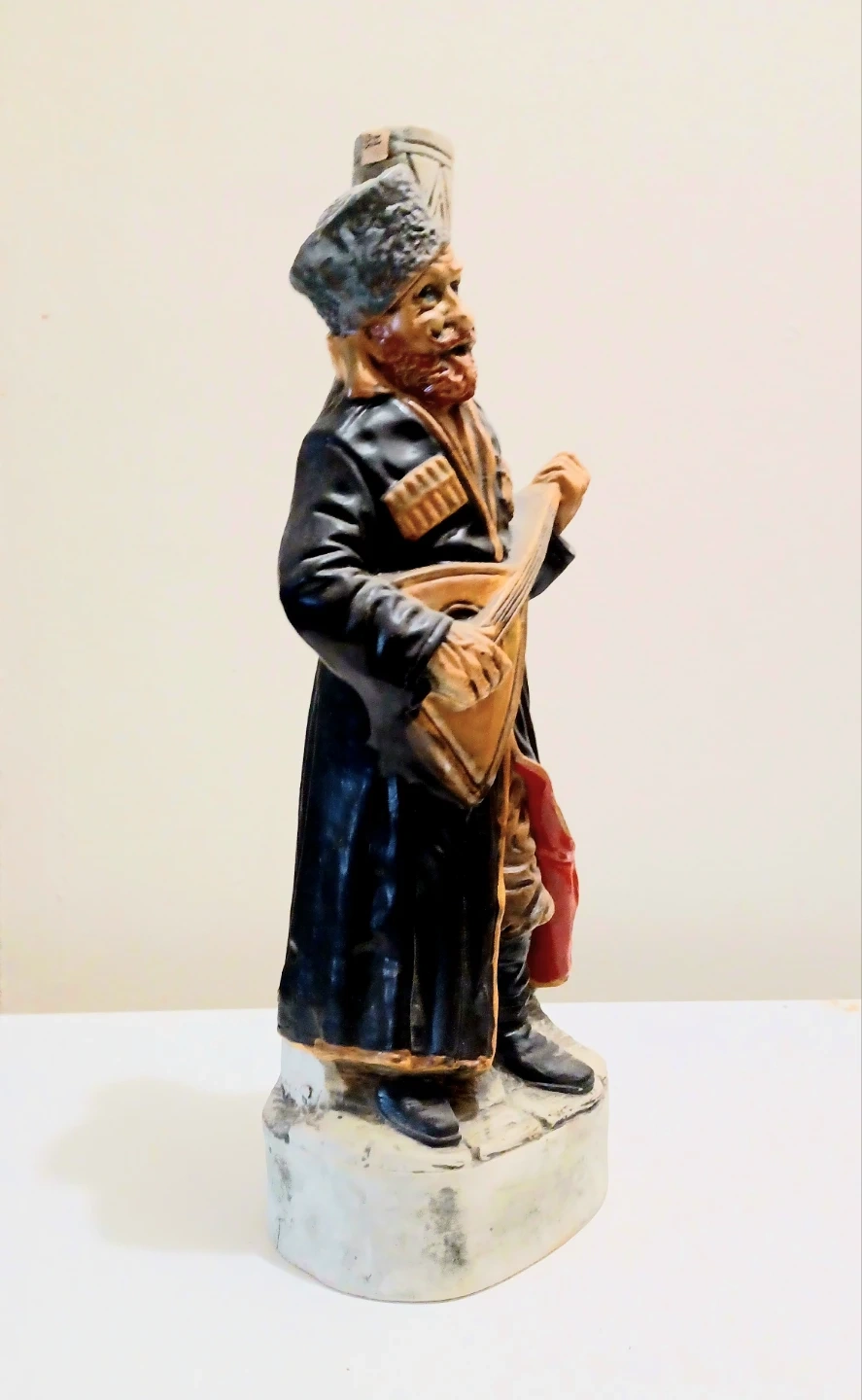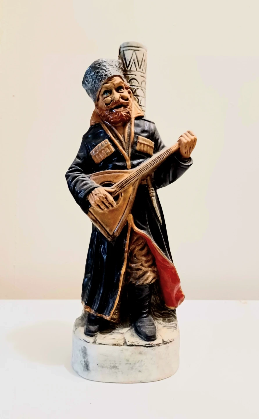 Unique, Vintage 1978, Hand Painted Russian Cossack Playing Balalaika Textured Ceramic Figurine Decanter , showcasing intricate details and craftsmanship. Made in Italy. About 12.50 inches Tall . Collectible Figurine