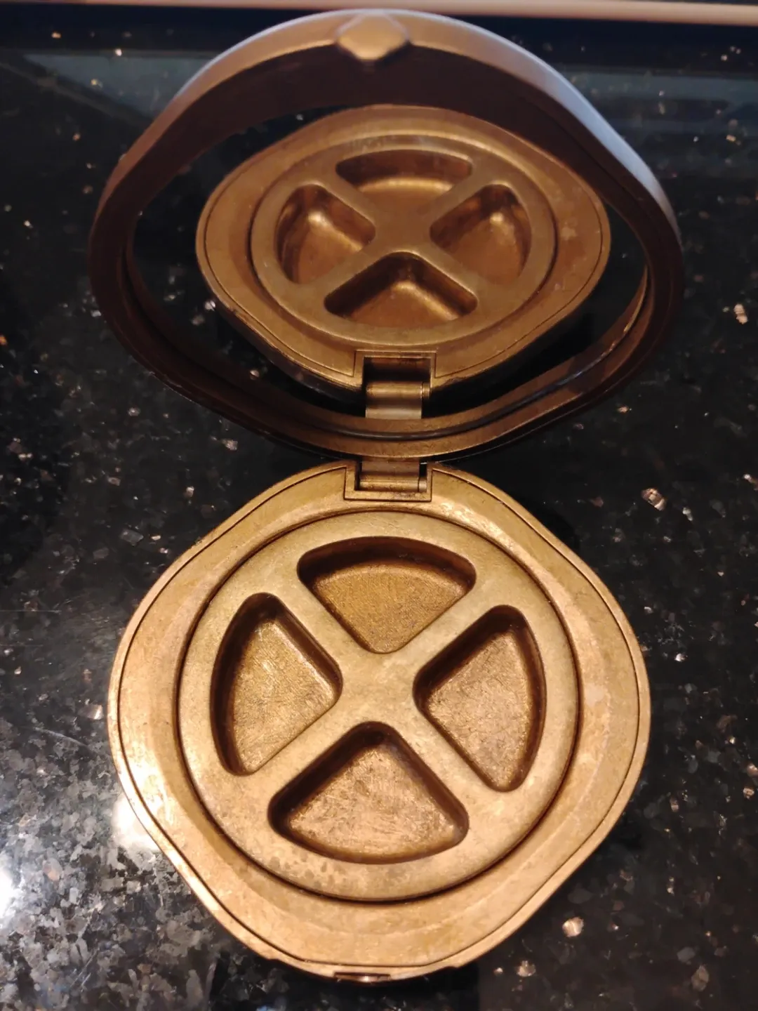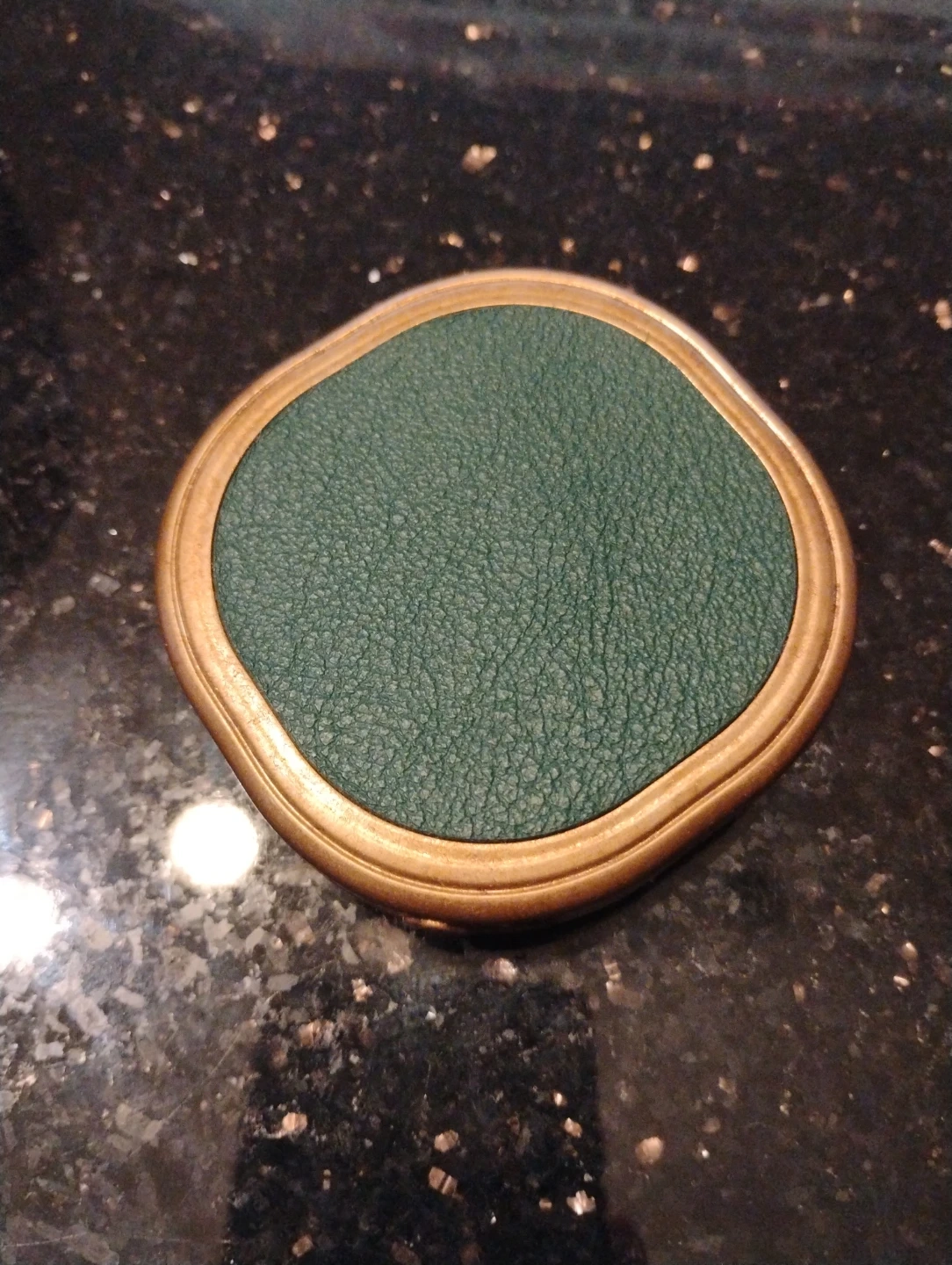 Movie set Prop. Painted compact mirror with a unique 4 quadrant compartment. It features a faux green leather accent on the lid and has compartments inside. Mirror is included and intact. The hinge works well and is magnetic.