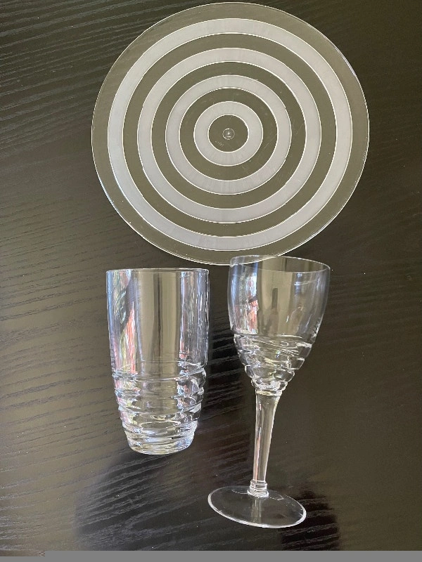 Clear set: four dishes, four water tumblers, four wine glasses and one big pitcher – $25.