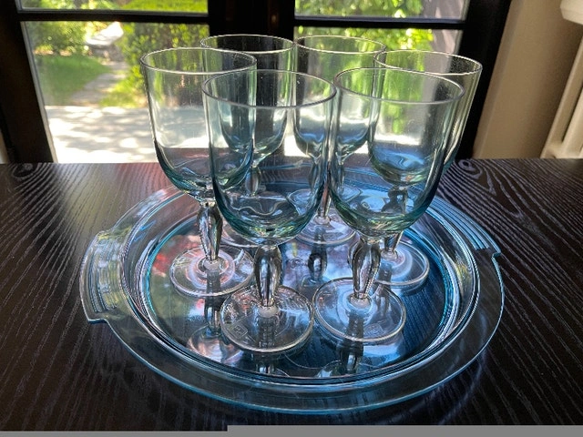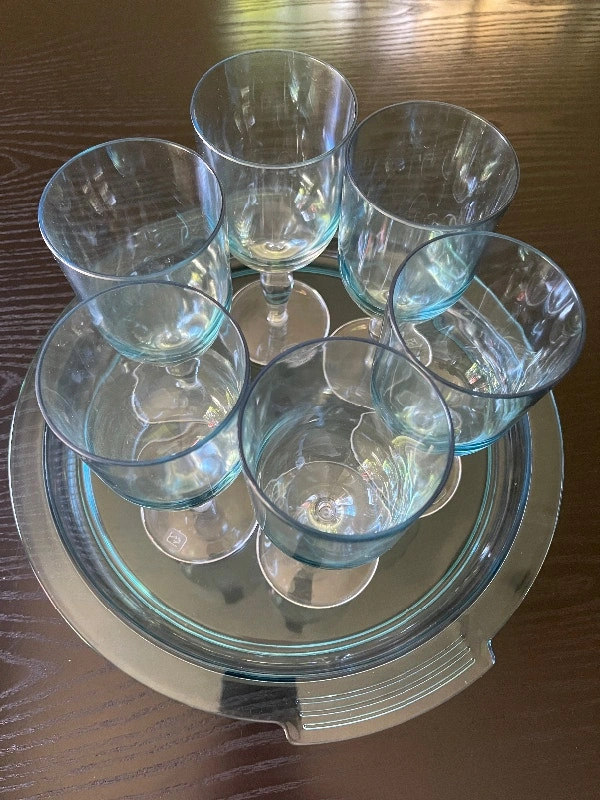 Blue set: six wine glasses/goblets plus serving tray – $15.