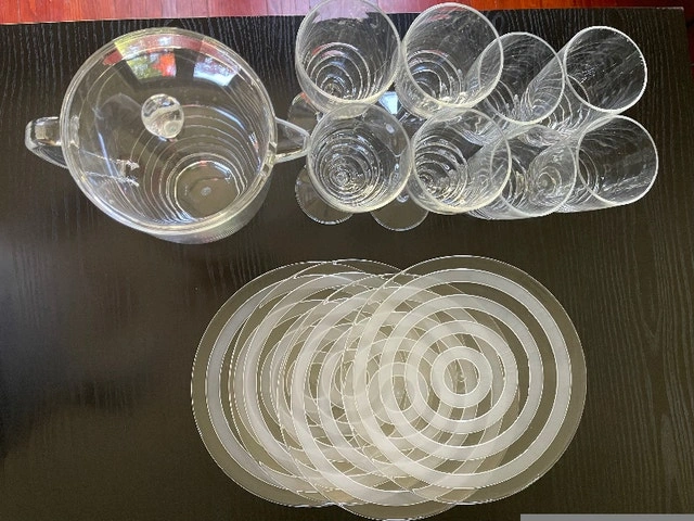 Clear set: four dishes, four water tumblers, four wine glasses and one big pitcher – $25.
