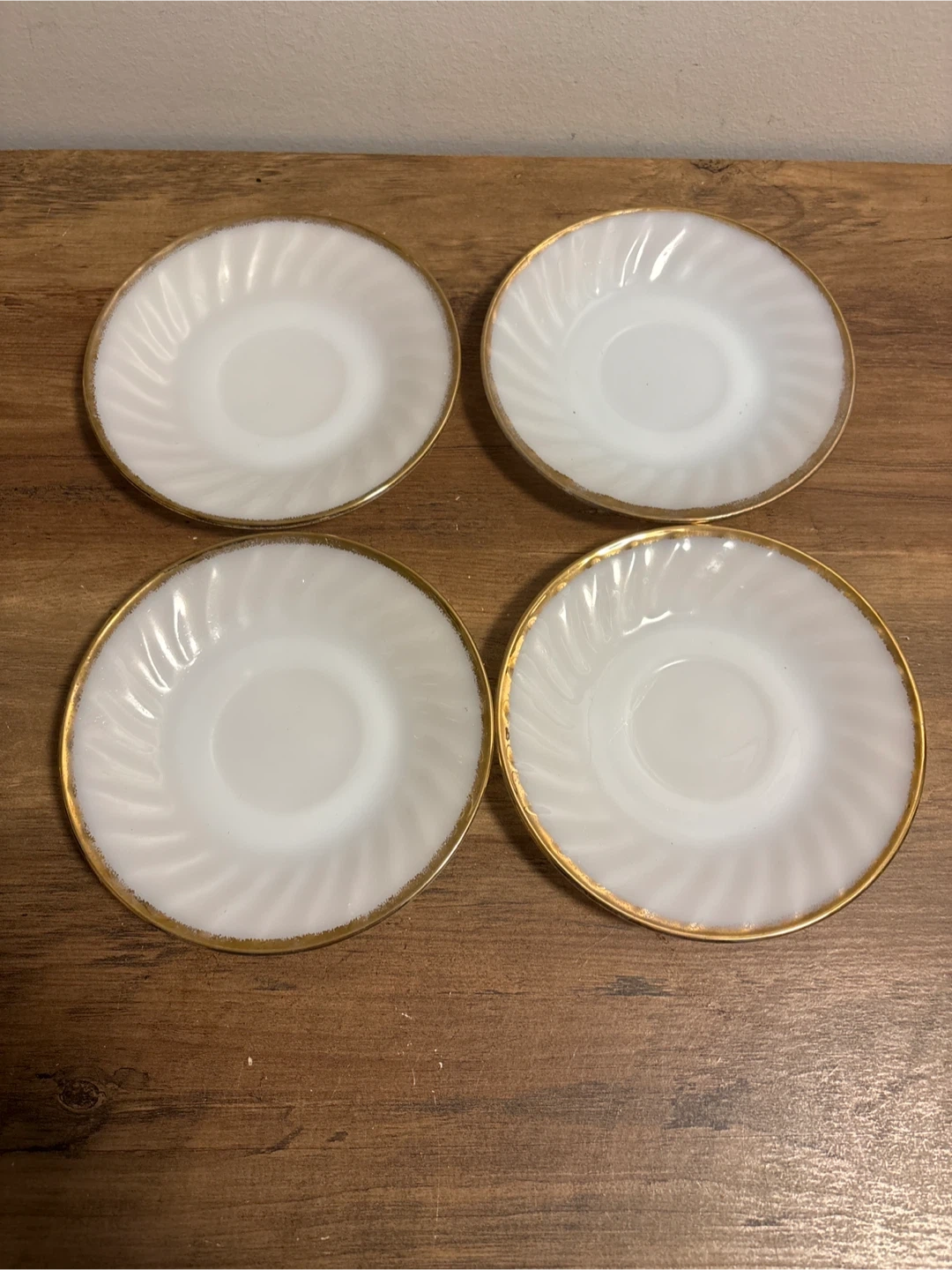 This is a set of four milk glass saucers by Fire-King. They feature a swirled pattern and a gold rim. Made in the USA.