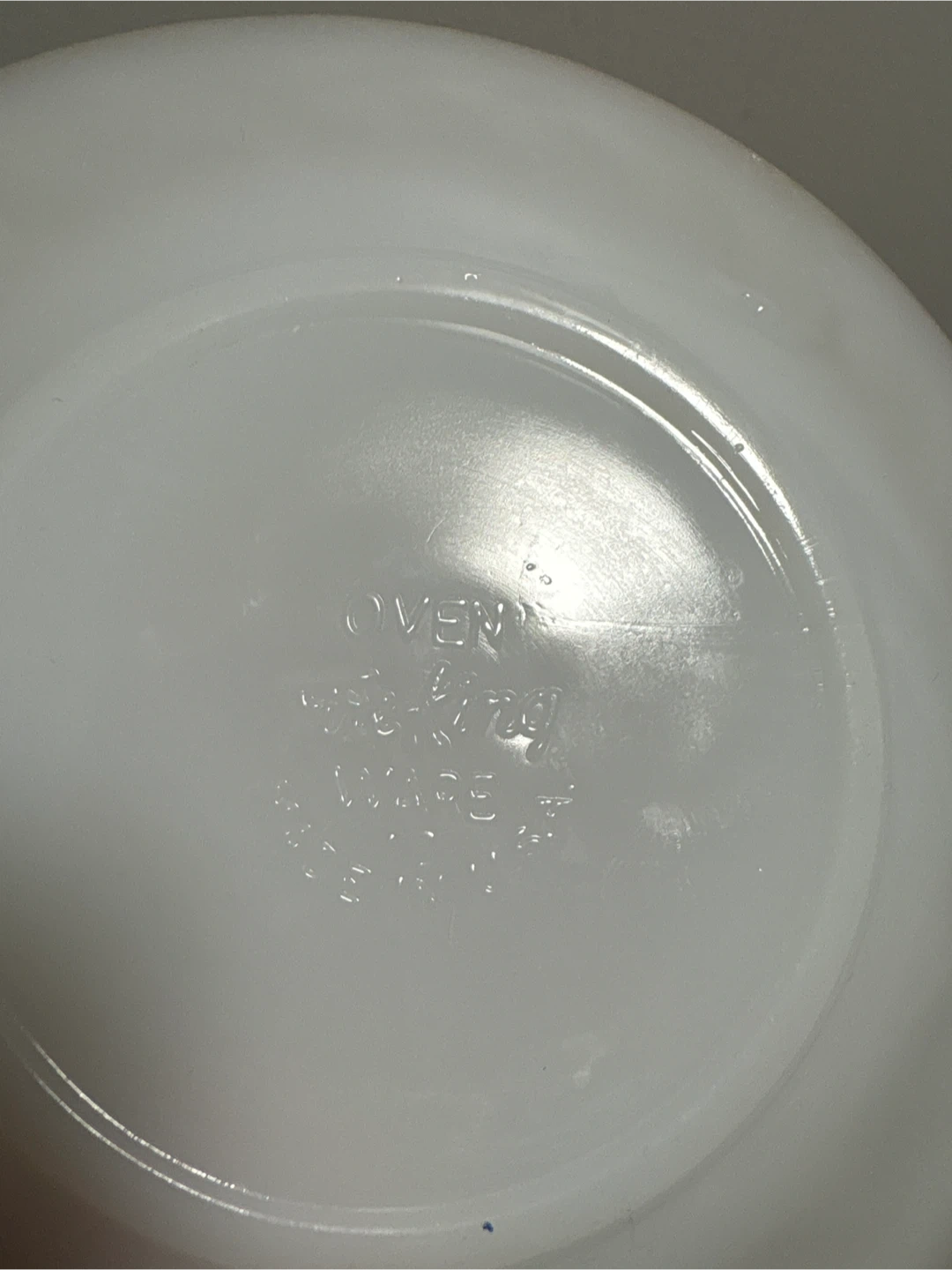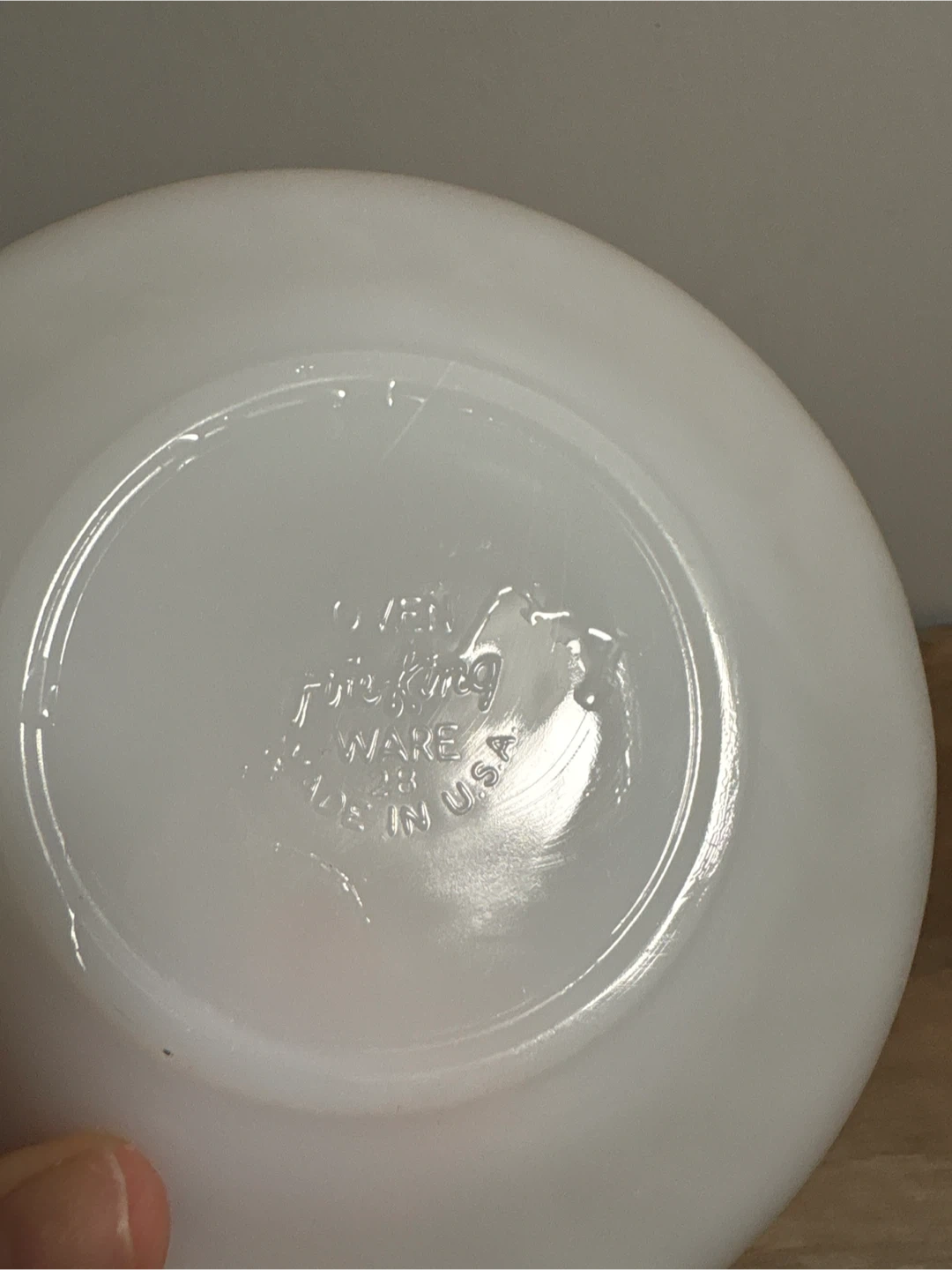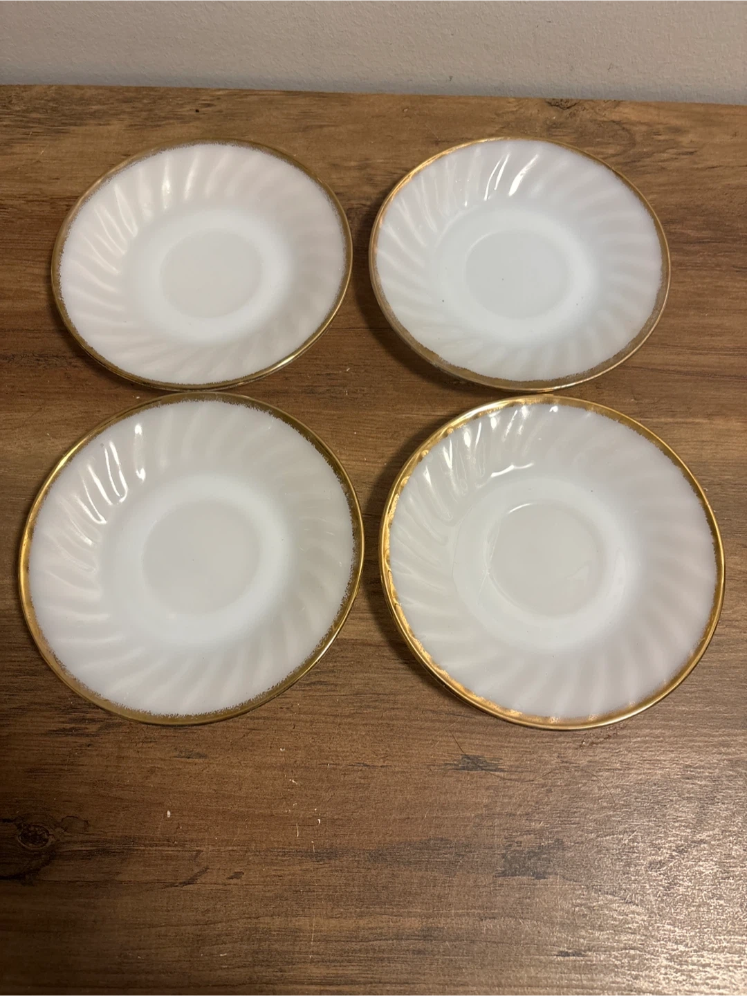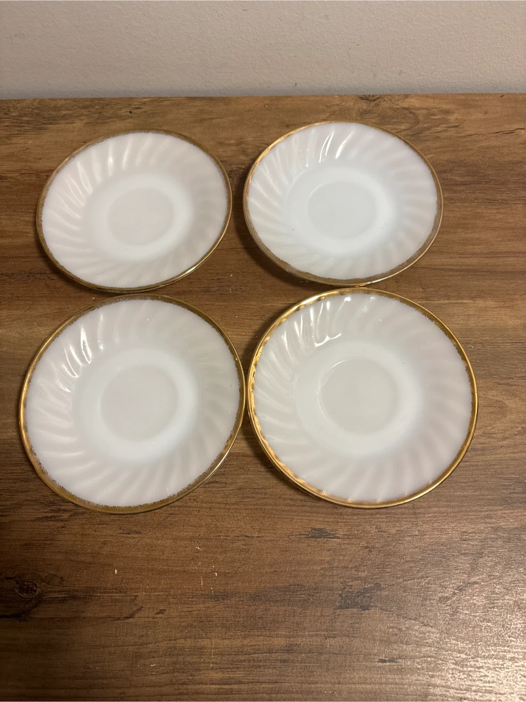 This is a set of four milk glass saucers by Fire-King. They feature a swirled pattern and a gold rim. Made in the USA.
