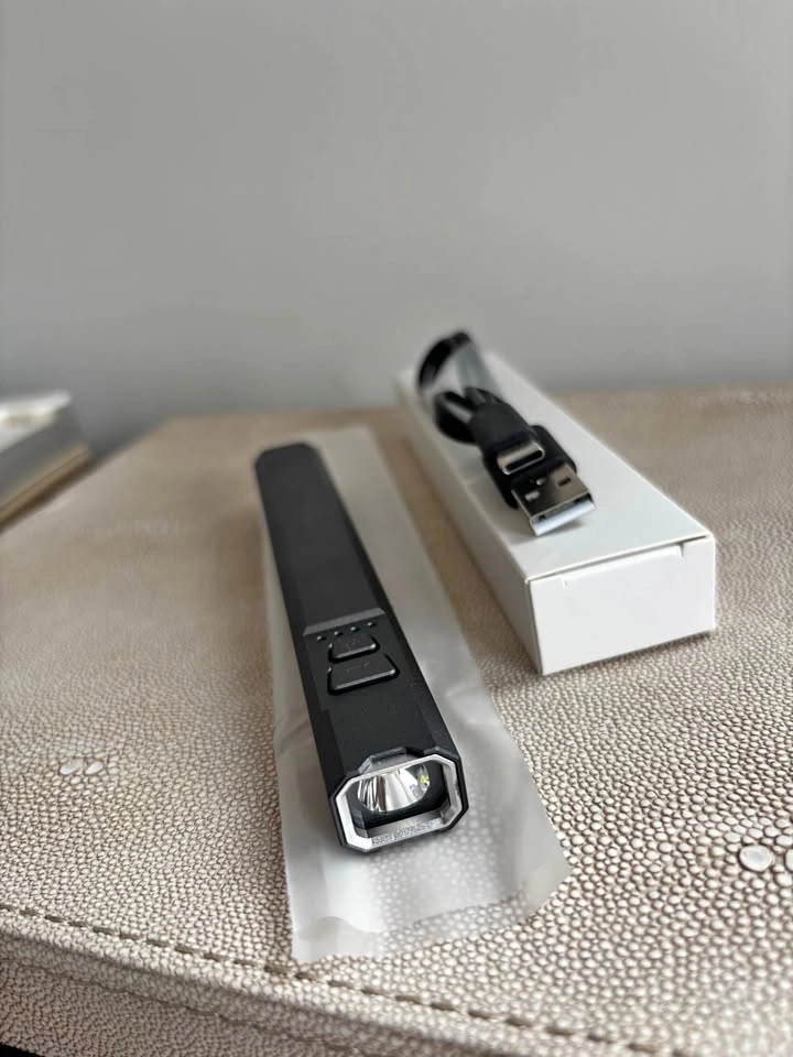 Brand new. 5.5 x 0.8 x 0.5 inches and weighs a mere 2.3 ounces. Boasts 5 distinct brightness modes: 1000lm (8 mins), 700lm (45 mins), 400lm (70 mins), 100lm (200 mins), and 30lm (600 mins). Includes Strobe Mode. Also features a green light laser. Let me know if you're interested!