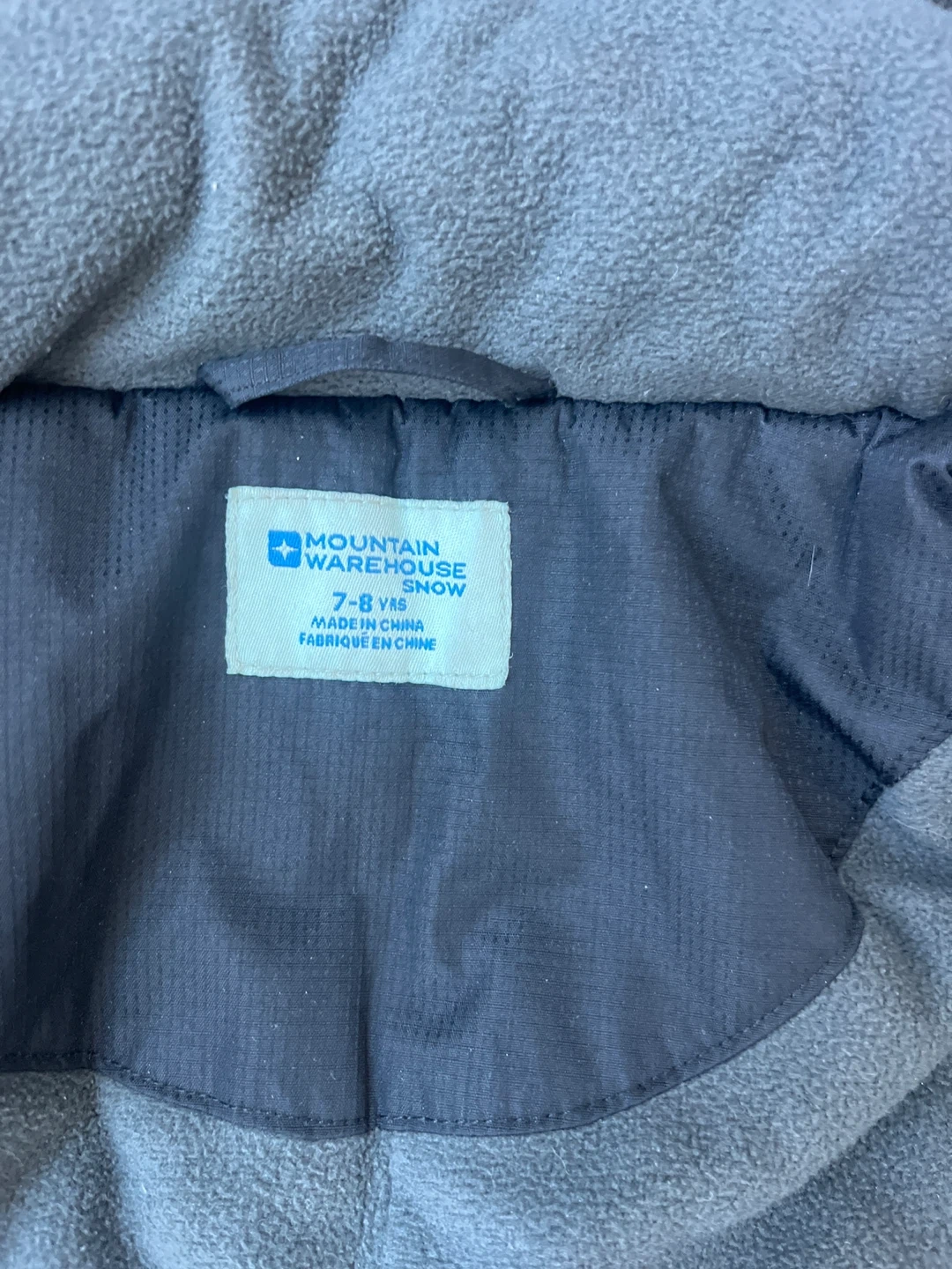 This is a Mountain Warehouse Snow jacket and snow pants set. The size is 7-8 years.