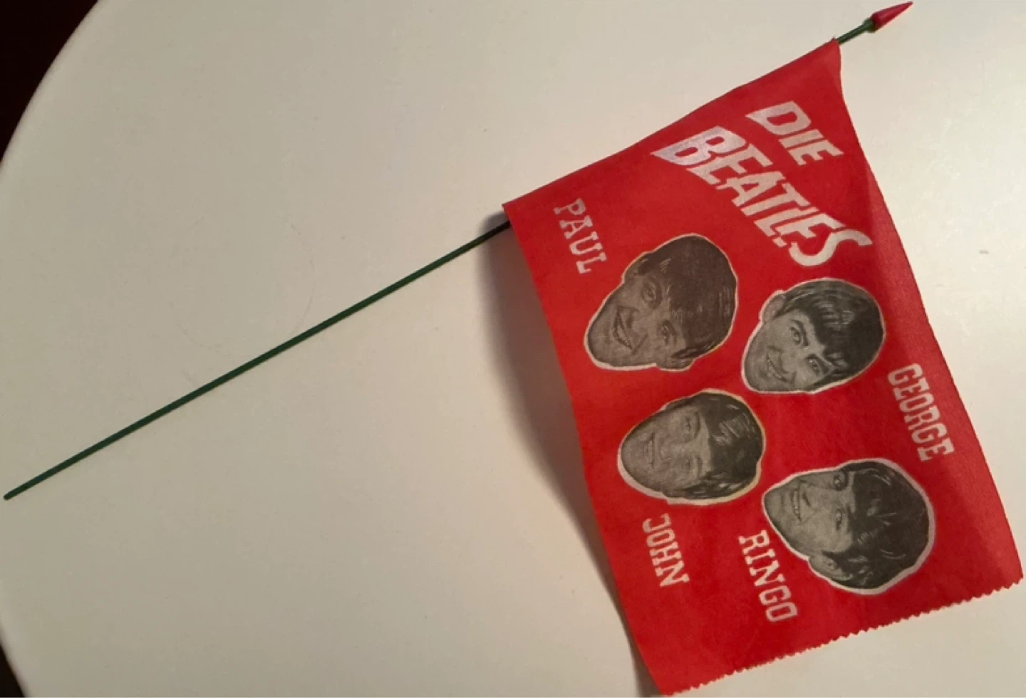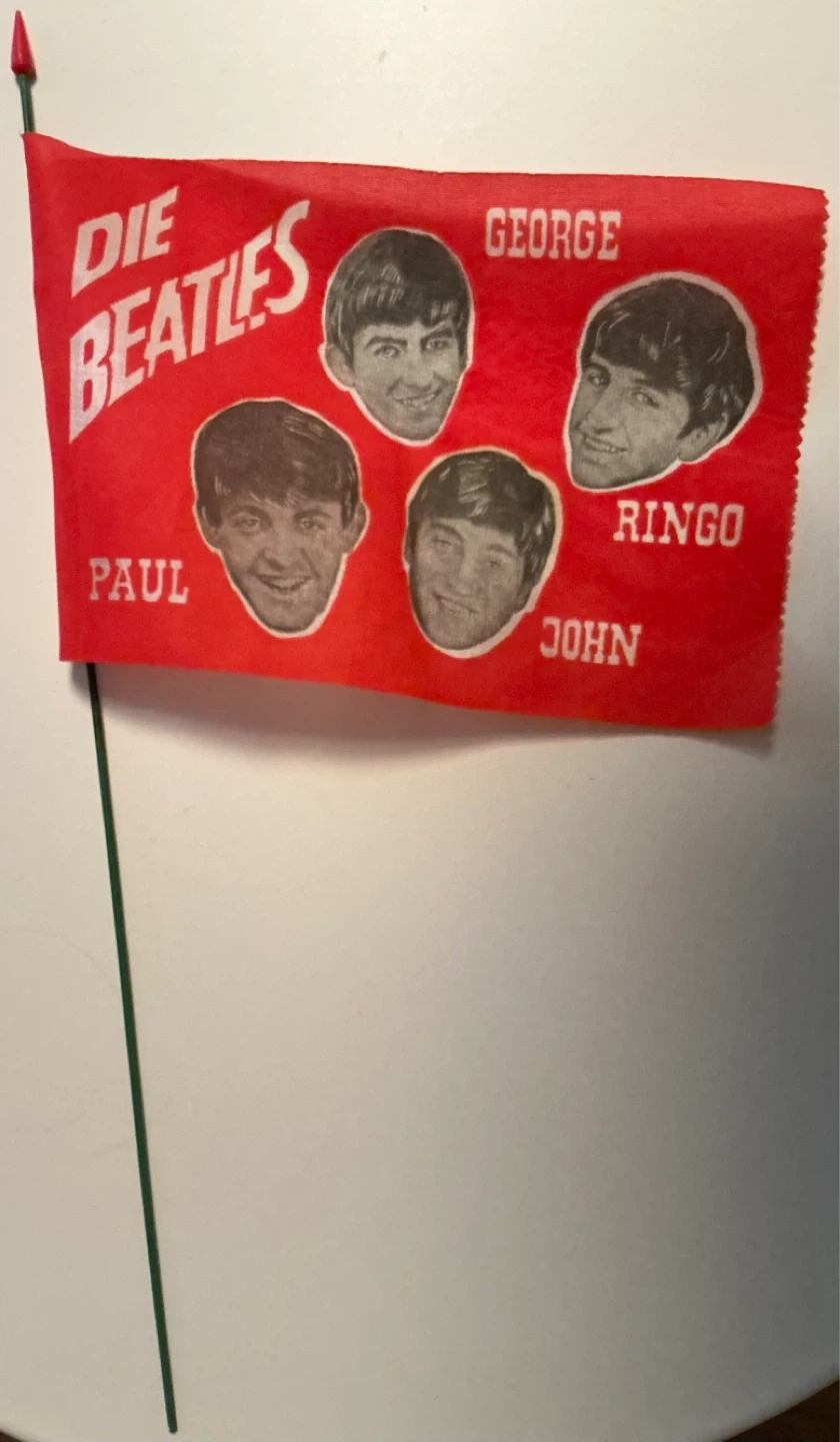 An Original small red German flag featuring the iconic "Die Beatles" logo with portraits of Paul, John, George, and Ringo. It's attached to a green metal stick with finial for display. This flag is perfect for any Beatles fan's collection!