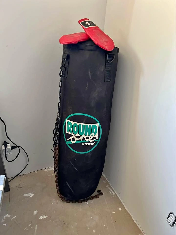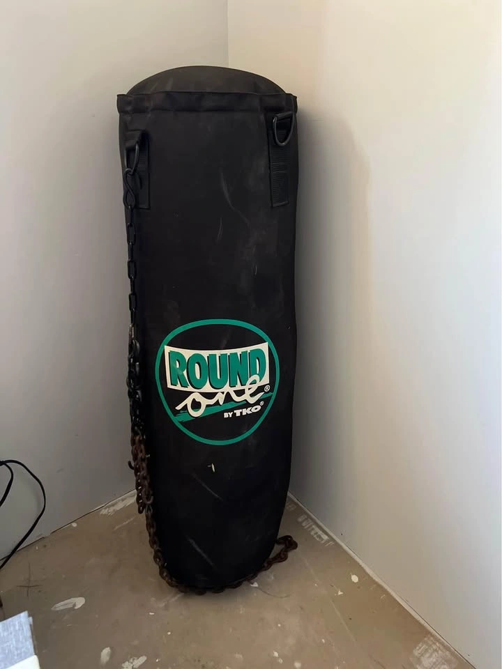 15Round One by TKO heavy bag with a pair of red gloves included! Perfect for boxing, kickboxing, or MMA training. $75 Dimensions: ~4-5 feet (estimated), weighs around 70-100 pounds. Pick up at Thornton,On