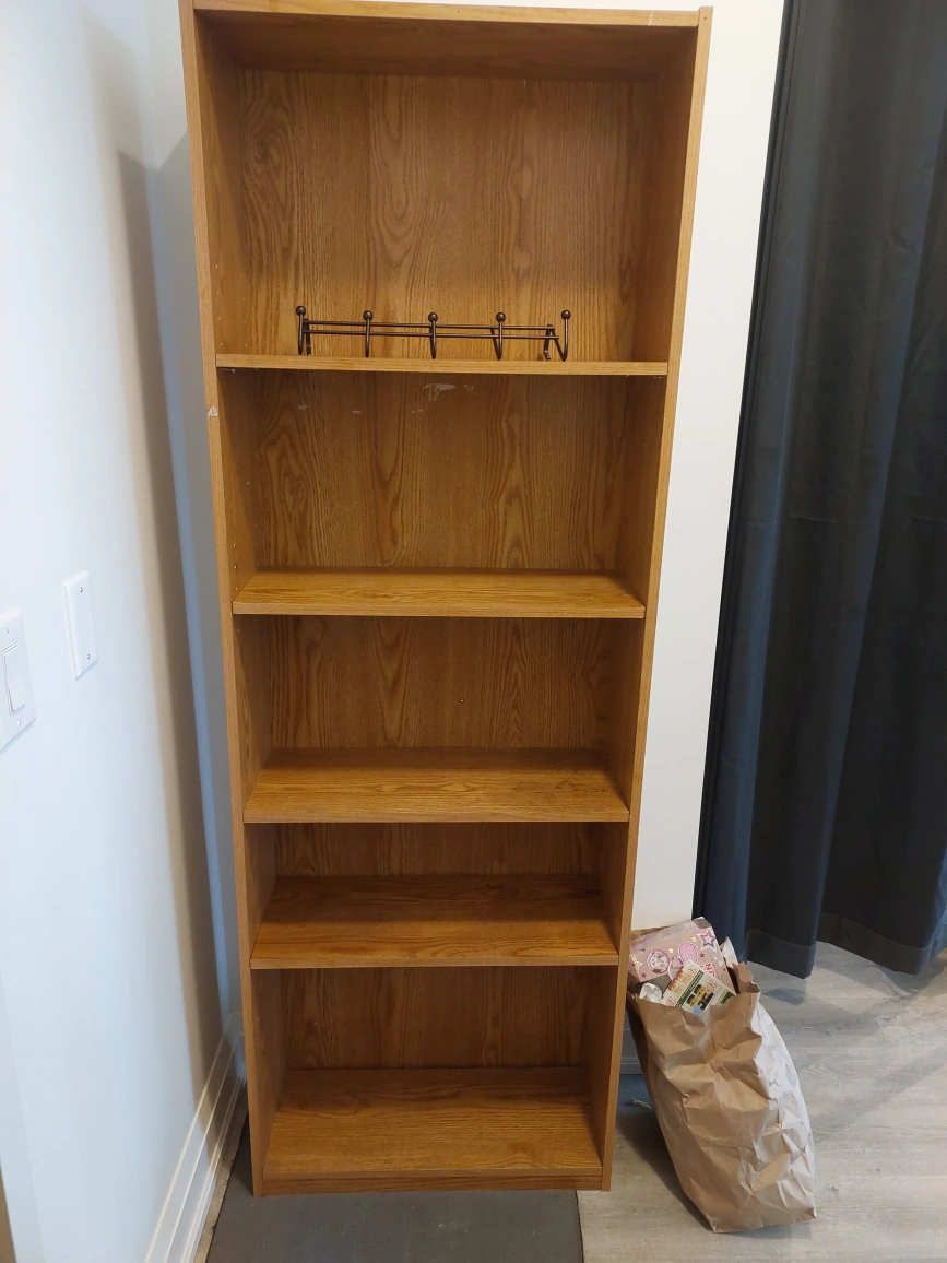 Buy & SellOak Wood Bookcase with 4 ShelvesOak Wood Bookcase with 4 Shelves$15Tall, narrow bookcase. Four shelves. Solid oak construction. Includes small wall-mounted hook rack.WHERE TO MEET2369 danforth aveView MapSELLERPrasanth GDanforth E York607 reviews4 chats·3 favorites·107 viewsSEND CHAT TO SELLERHi Prasanth G! I’m interested in your listing.Hi Prasanth G! I’m interested in your listing.Get the Karrot app to chatSign In to chat