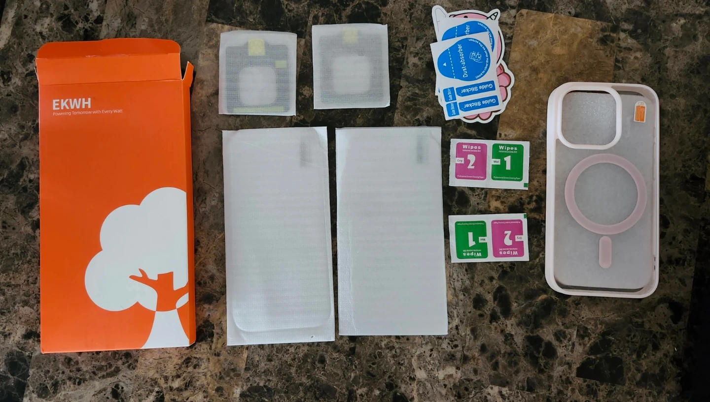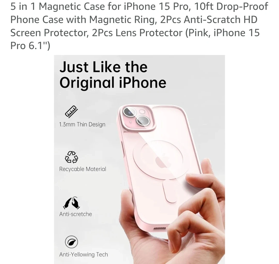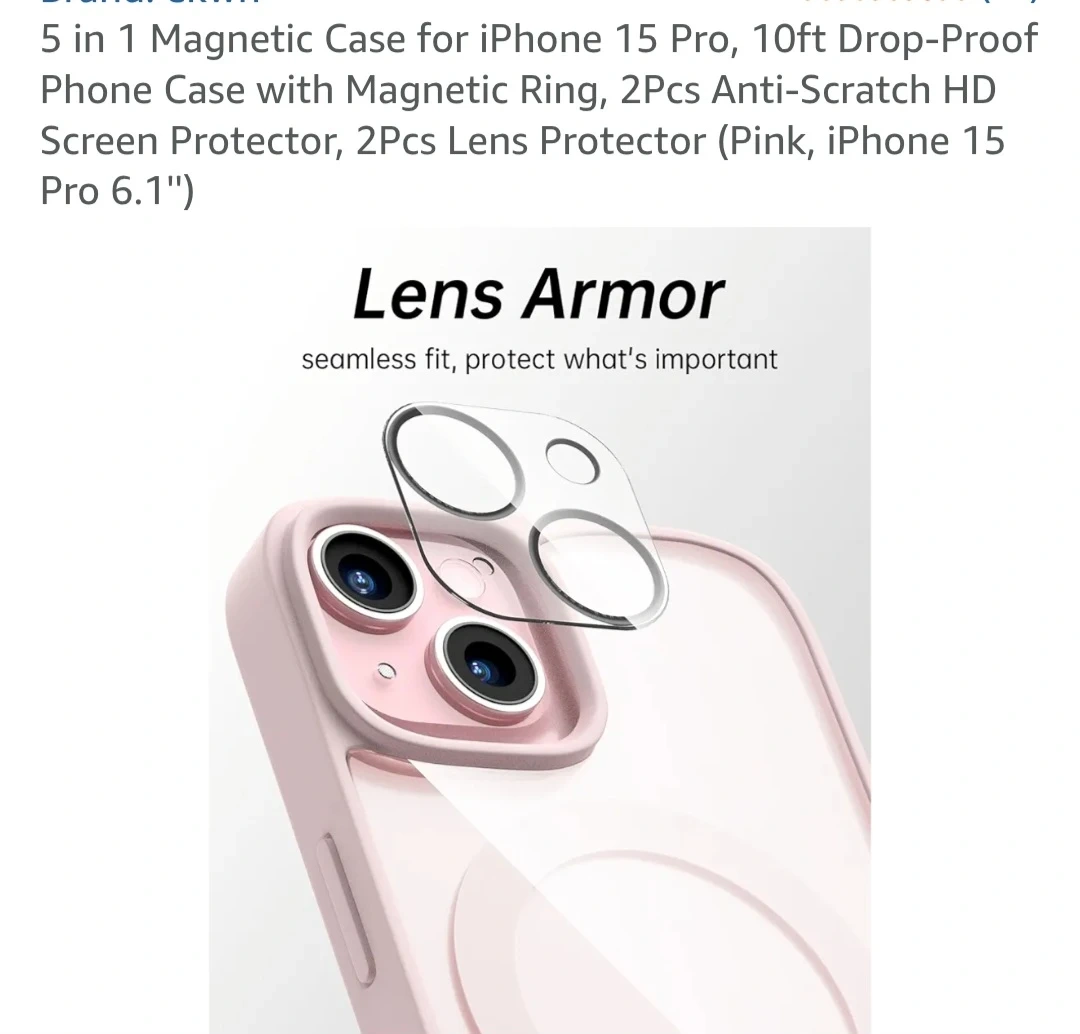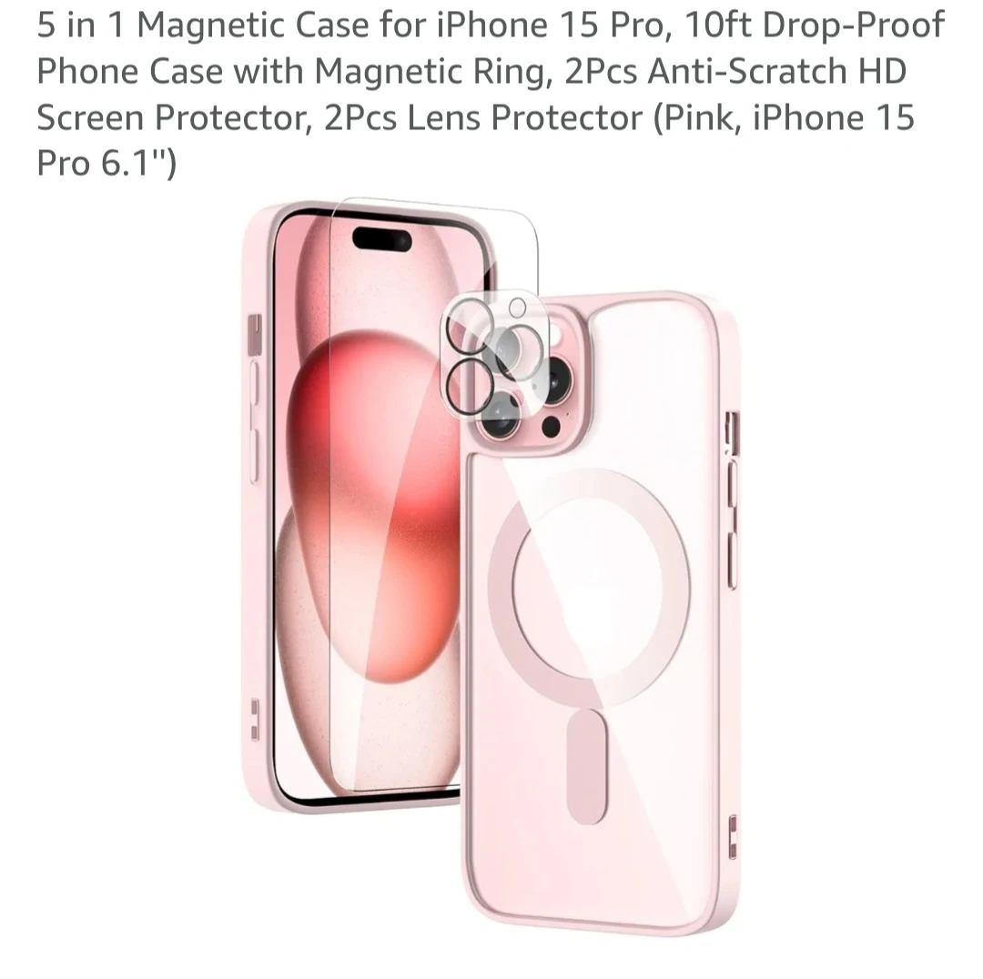 This is a 5-in-1 magnetic case kit for an iPhone 15 Pro. It includes a pink case with a magnetic ring and two anti-scratch screen protectors and two lens protectors.