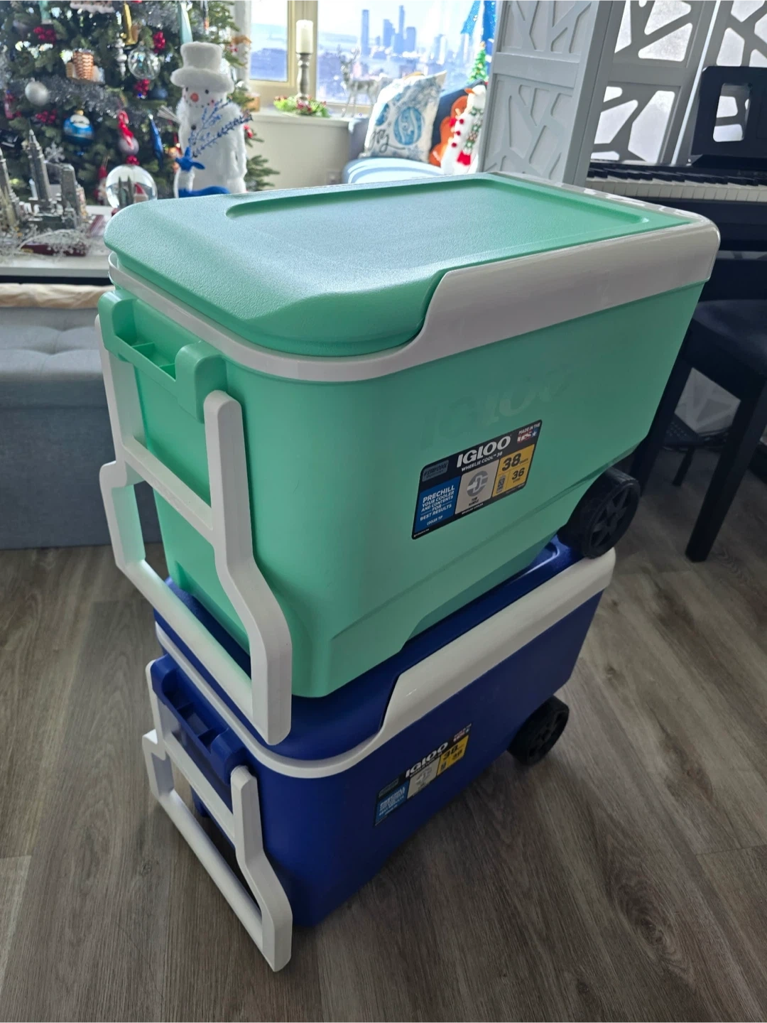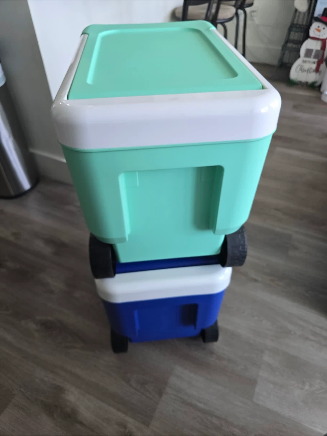 I have two Igloo ice chests for sale! One is a cool mint color, and the other is blue. Both are 38-quart capacity and have wheels for easy transport. Perfect for picnics, camping, or tailgating
