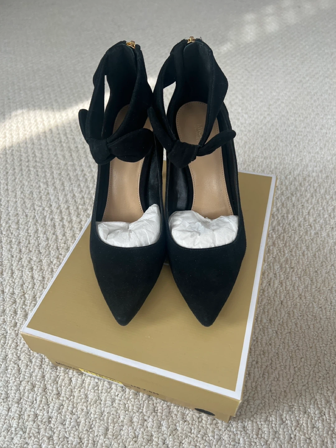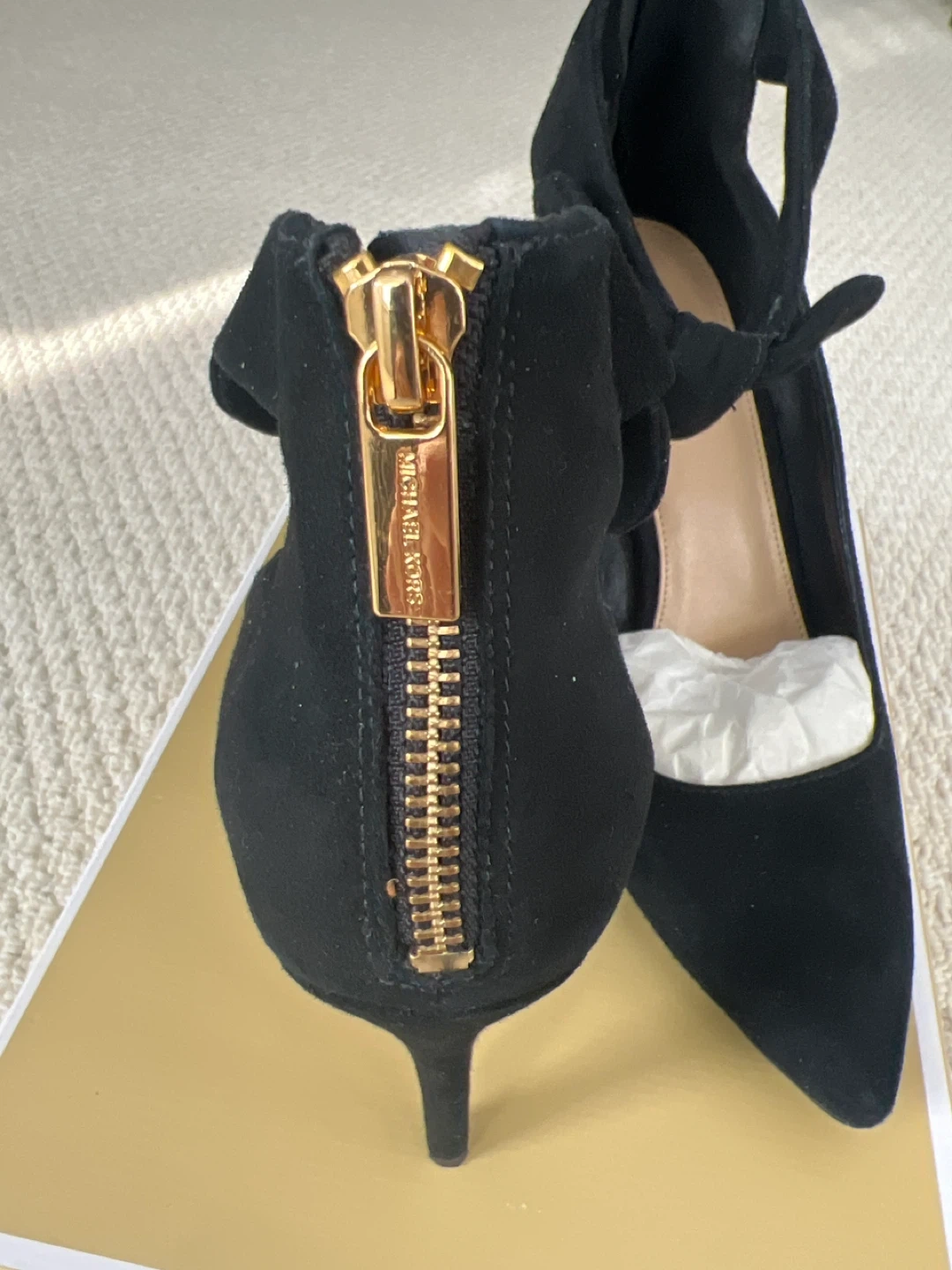 Michael Kors black suede heels with a gold zipper closure. Features a tie ankle strap and pointed toe. Original box included. Size 7.5. New, wore once to a wedding. Beautiful shoes. Asking 150.00 firm
