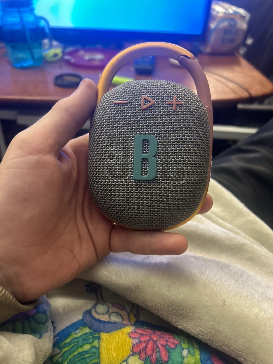 This is a JBL Clip 4 portable Bluetooth speaker in orange. It's small and lightweight, making it easy to take anywhere. The clip allows for secure attachment to bags or belts.