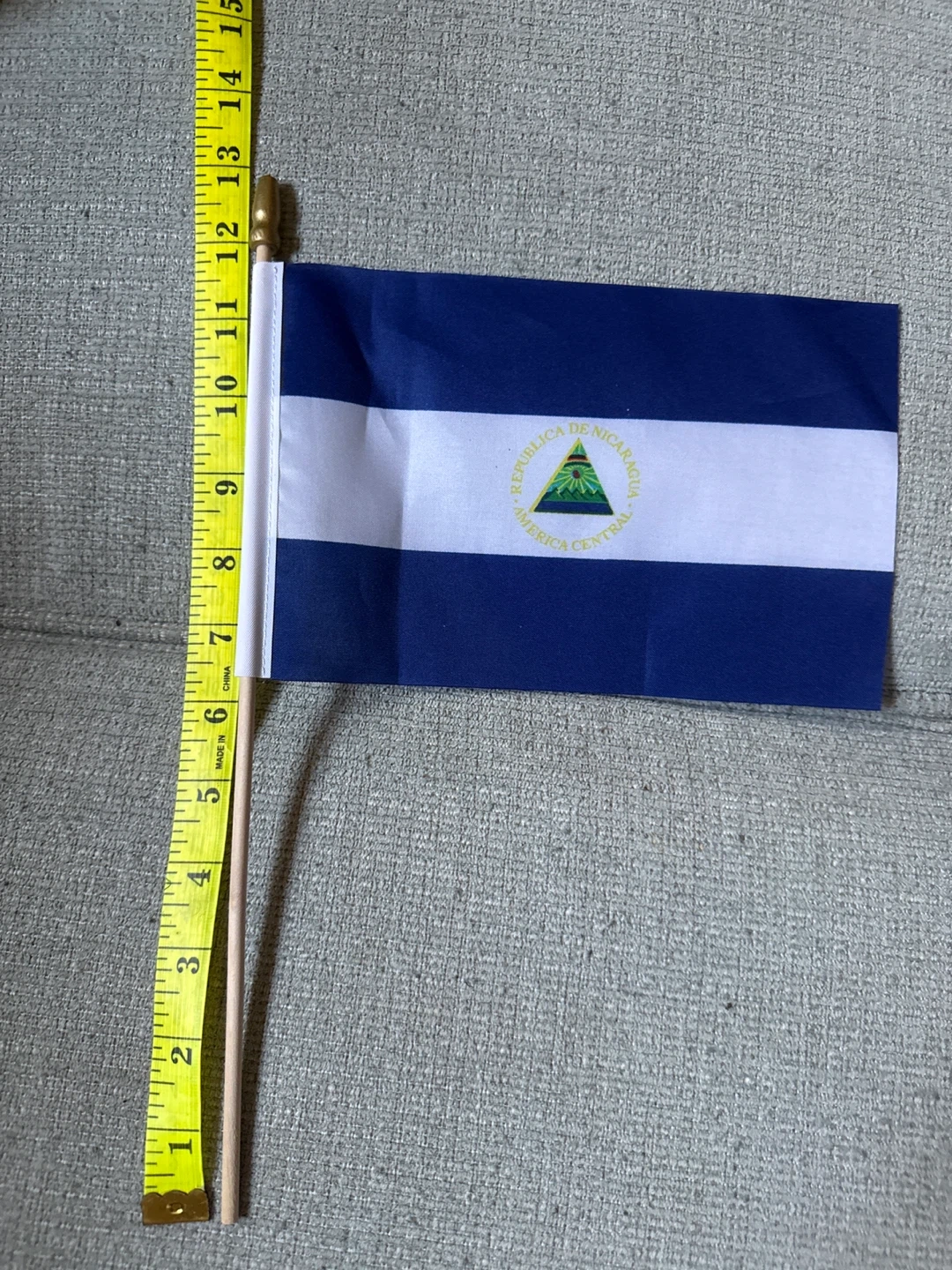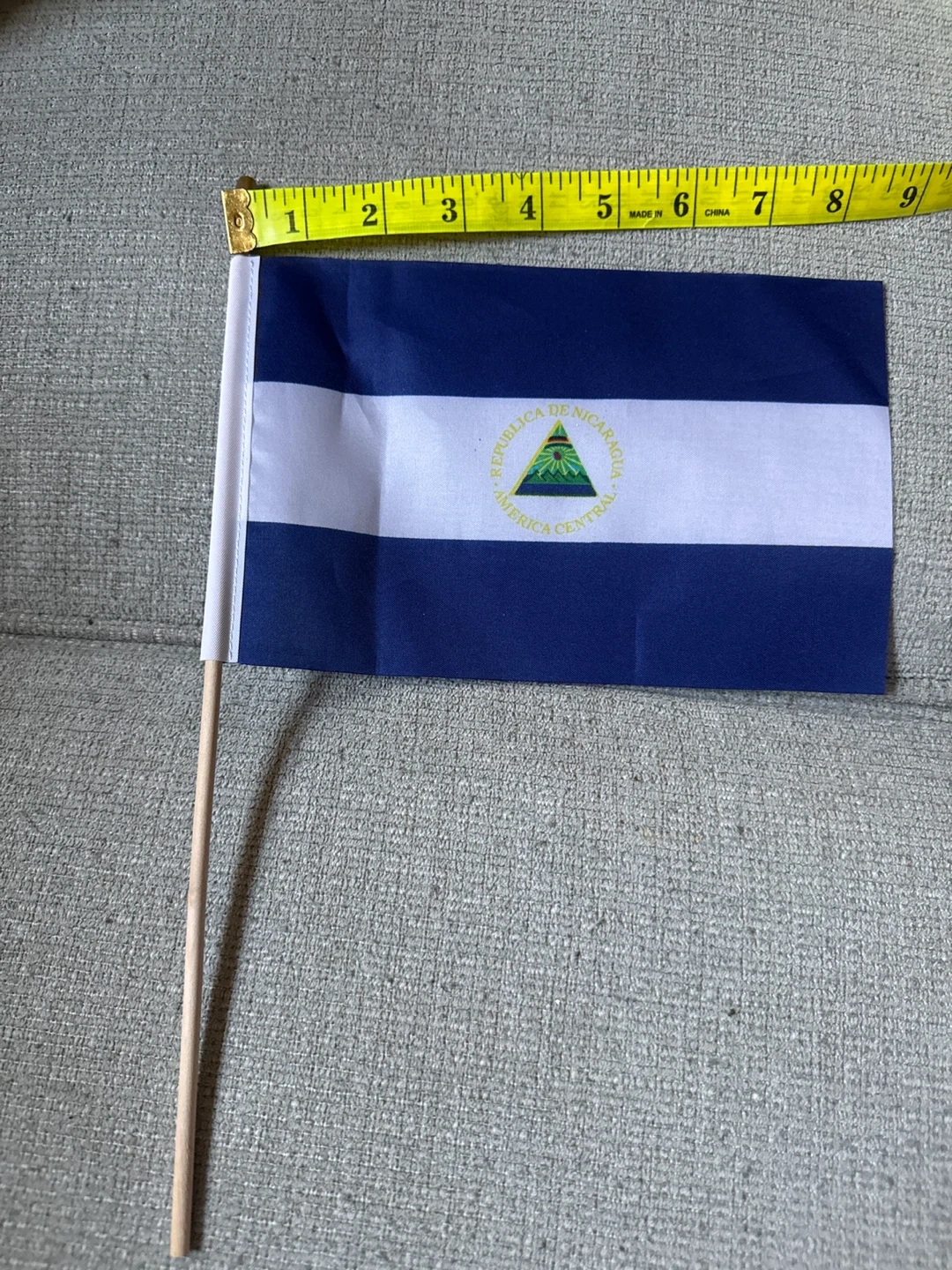 Giving away. This is a handheld flag of Nicaragua on a wooden stick. The flag measures approximately 13 inches by 8 inches. It's made of polyester fabric.
