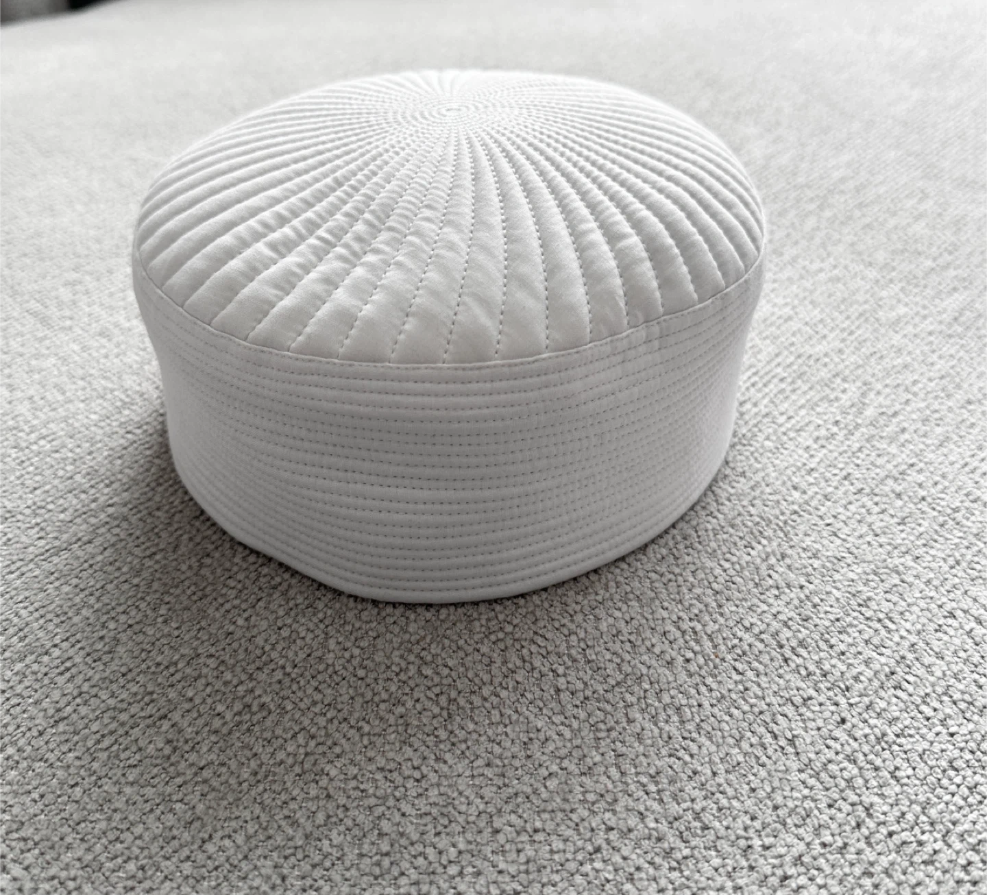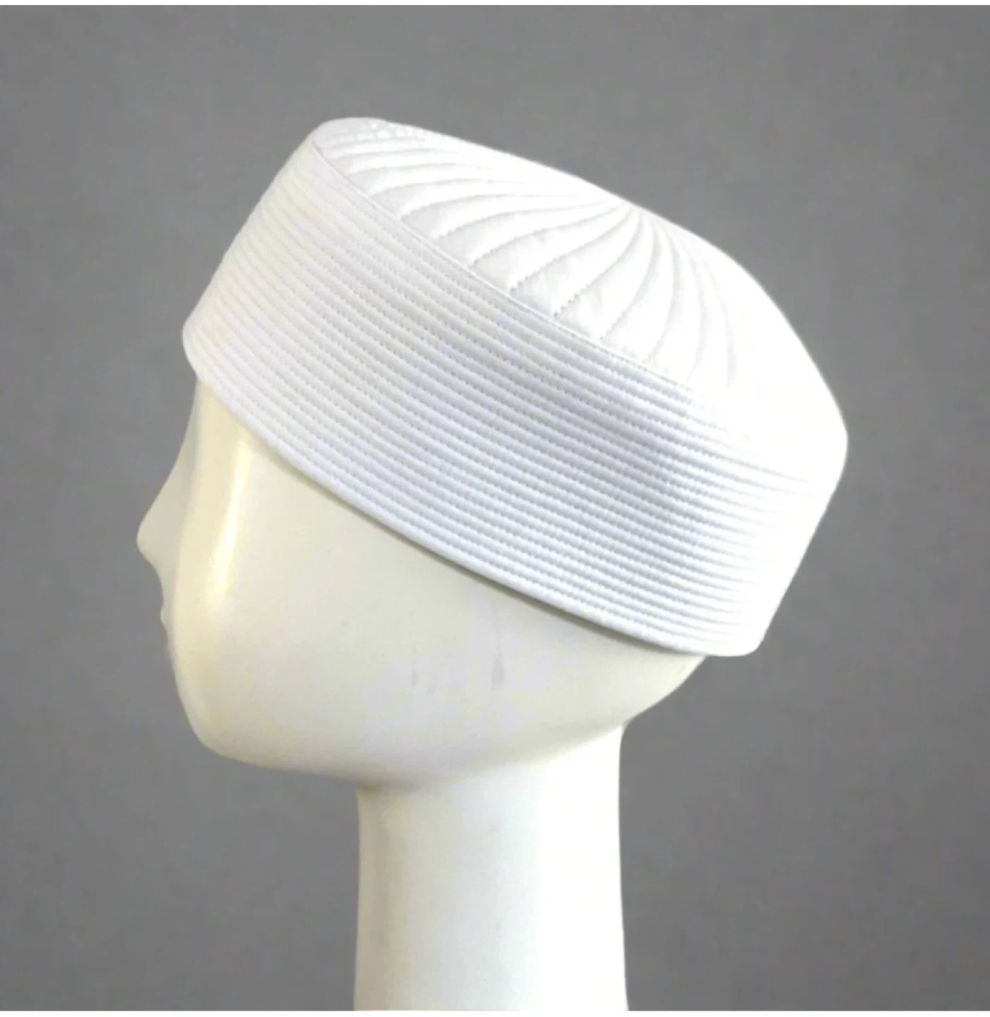 This is an Al Deebaj Kufi hat in white. It's 22.5 inches in size. The hat features a quilted pattern on top with ribbed detailing around the brim. It's made of a soft fabric material.