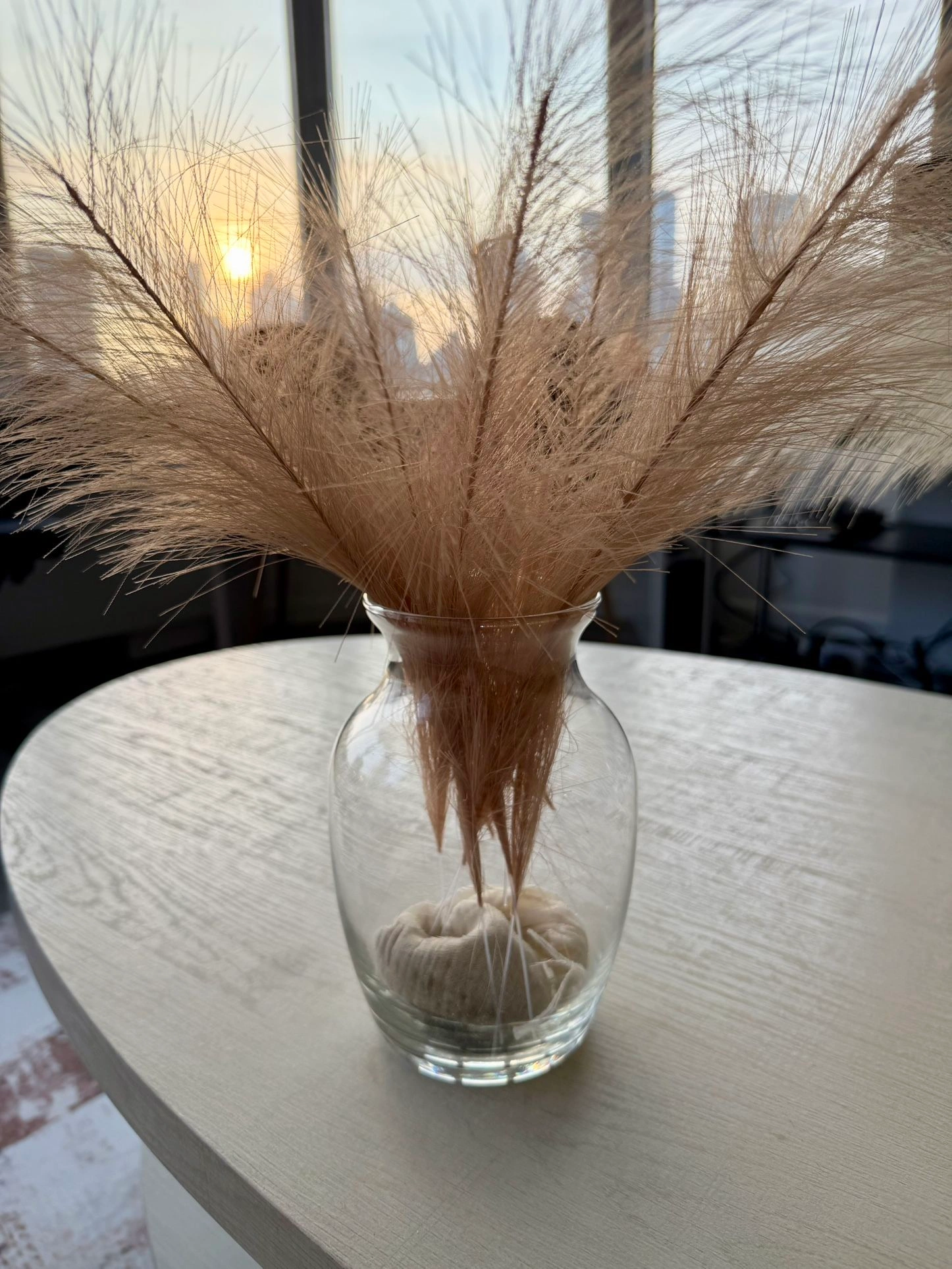 - Includes a tall cylinder vase and a rounded glass vase, both with faux pampas plumes.