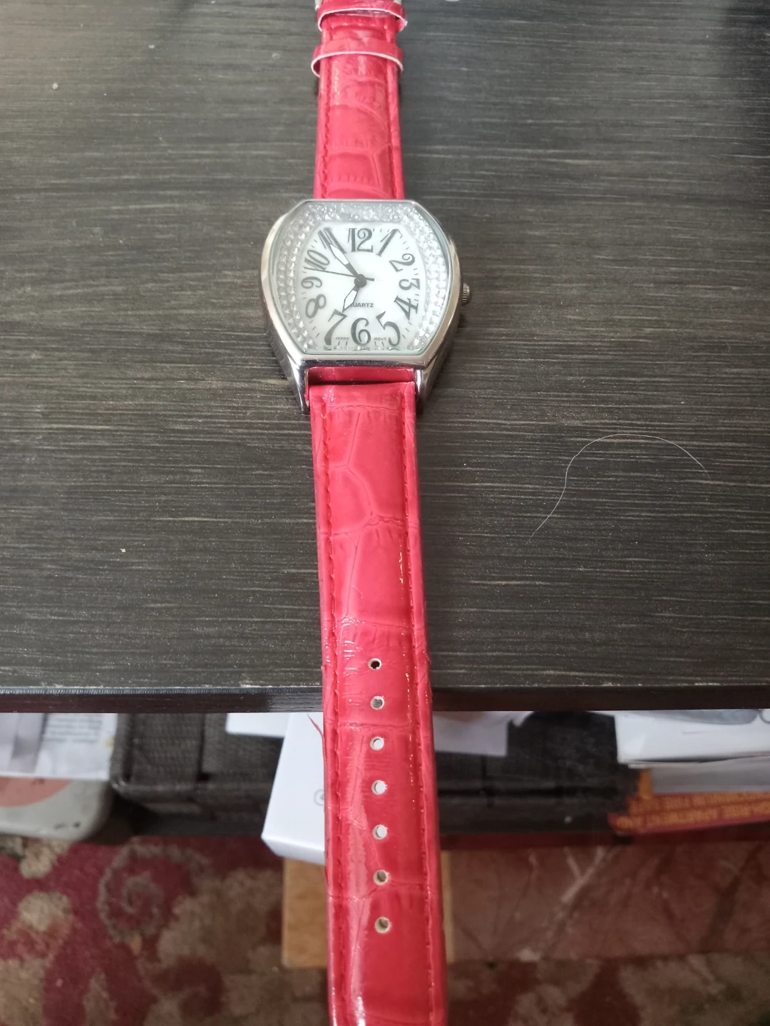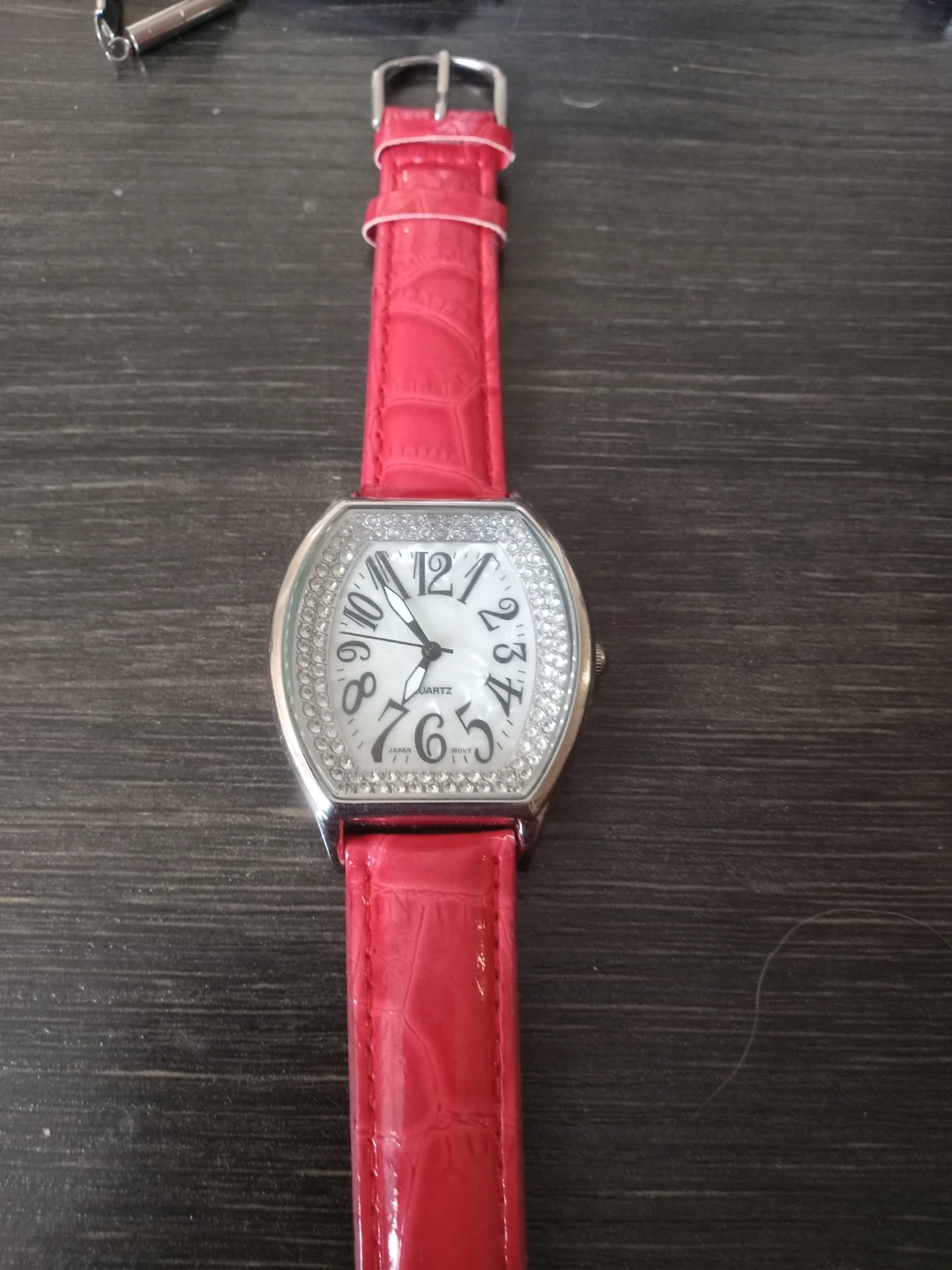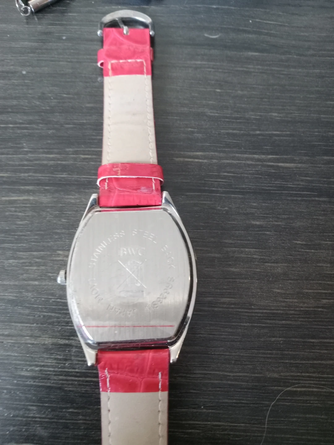 This BWC quartz watch features a white dial with Arabic numerals and a crystal-embellished bezel. It has a pink, croc-embossed faux leather strap with a buckle closure. The back is marked 'Stainless Steel Back' and 'Japan Movt'.