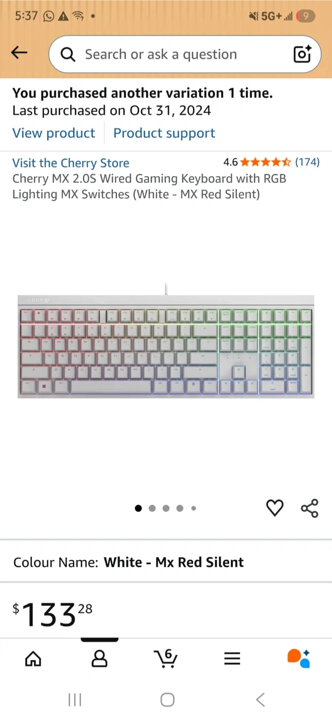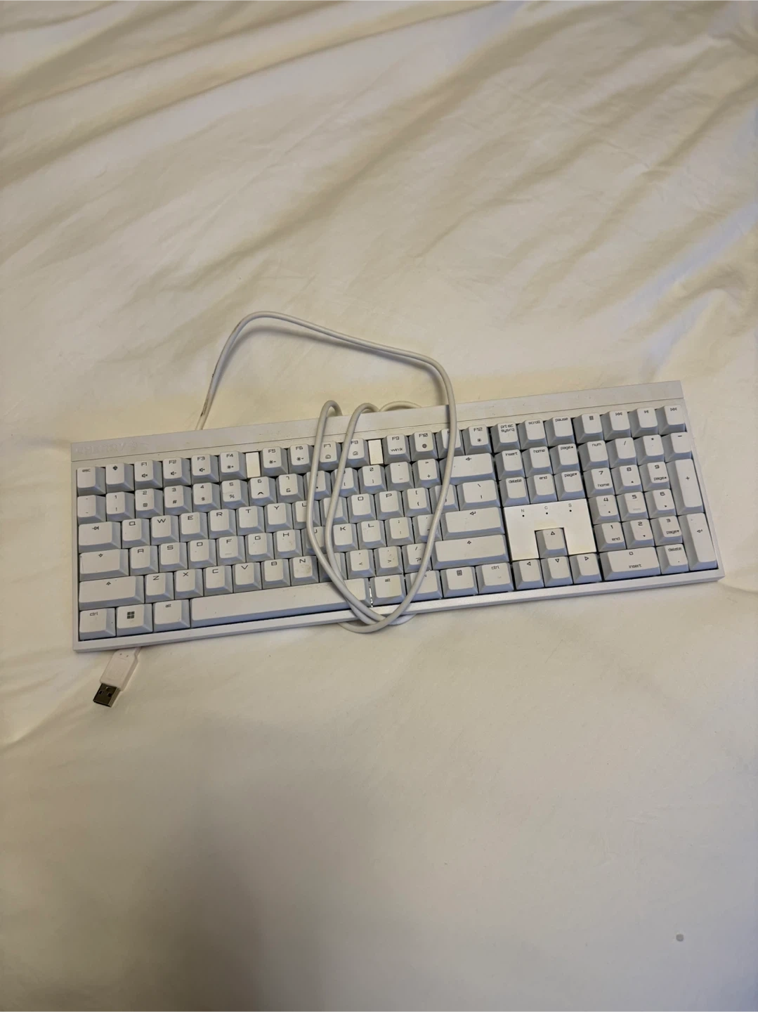 This is a white Cherry MX 2.0S wired keyboard. It features RGB lighting with MX Red Silent switches. It's a full-size keyboard with a numeric keypad.