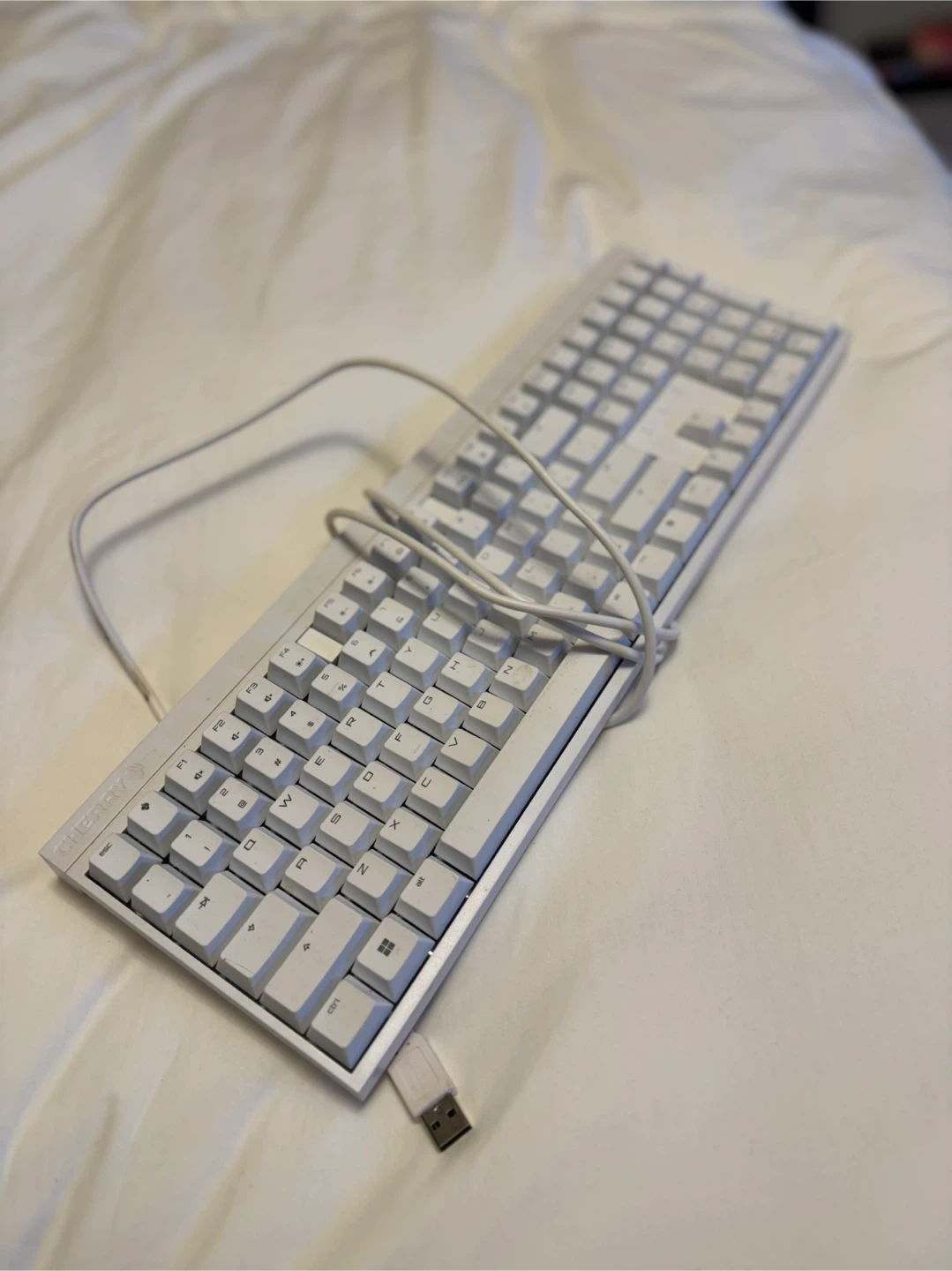 This is a white Cherry MX 2.0S wired keyboard. It features RGB lighting with MX Red Silent switches. It's a full-size keyboard with a numeric keypad.