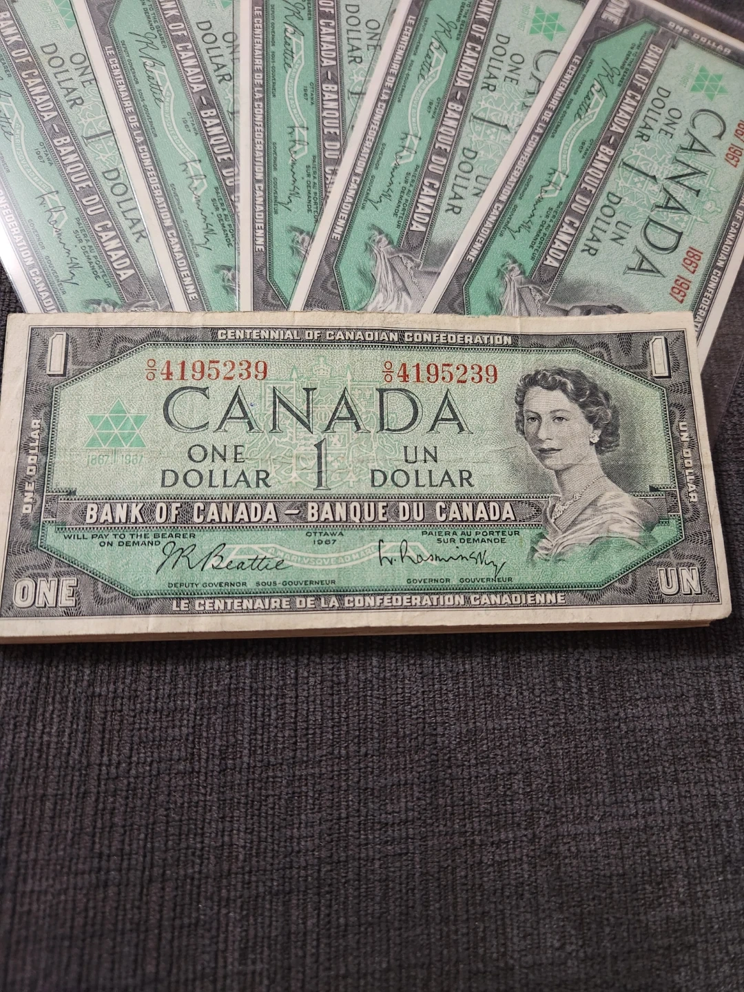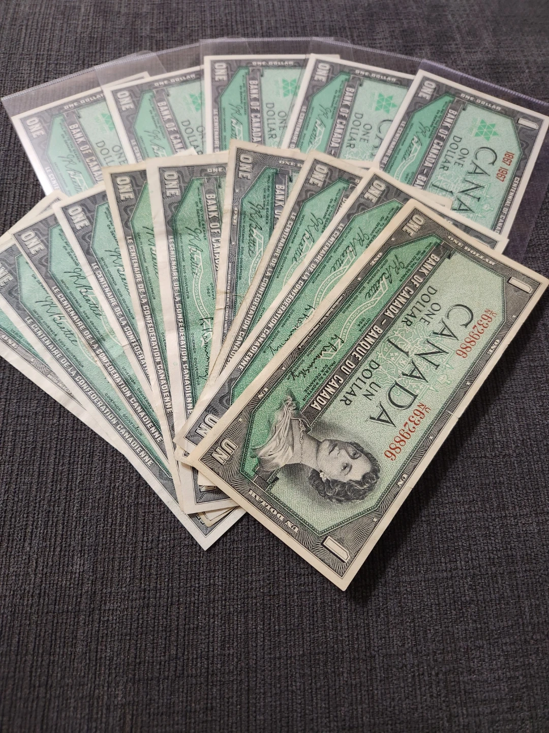 Collection of Bank of Canada one dollar bills commemorating the 1967 Centennial of Canadian Confederation. Features Queen Elizabeth II. Bills are in good condition.$10 each or 10 Pieces for $80, All prices are Firm