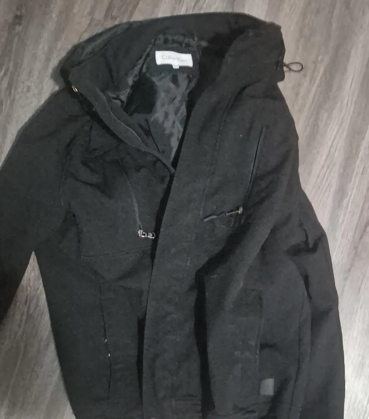 This is a black Calvin Klein hooded jacket. It features a toggle closure and multiple pockets. Material appears to be a blend, with a patterned lining.