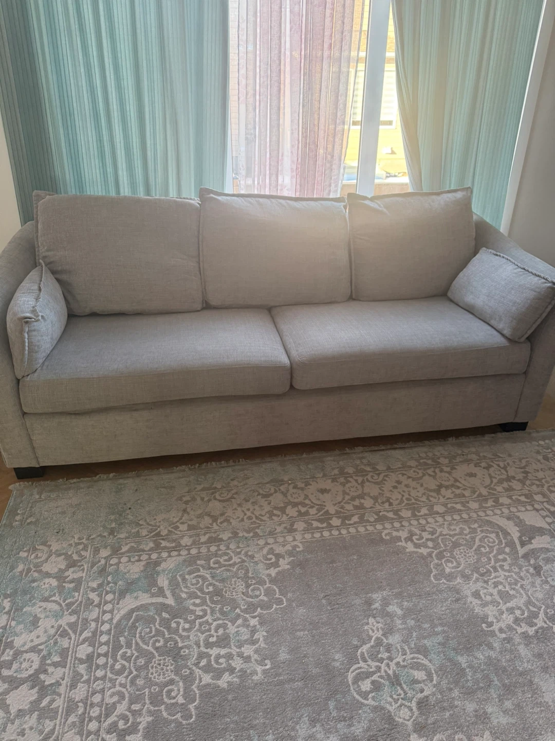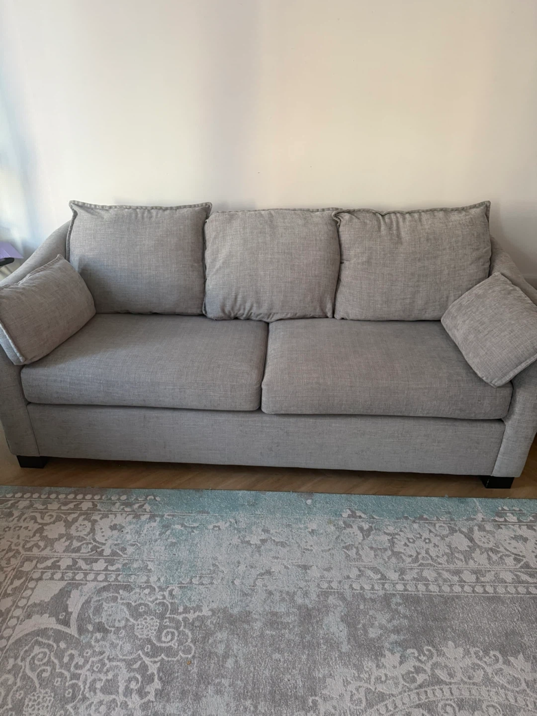 This is a comfy grey sofa with three large back cushions and two smaller armrest pillows. It's upholstered in a textured fabric. Perfect for a living room or den! covers come off for easy washing area rug included