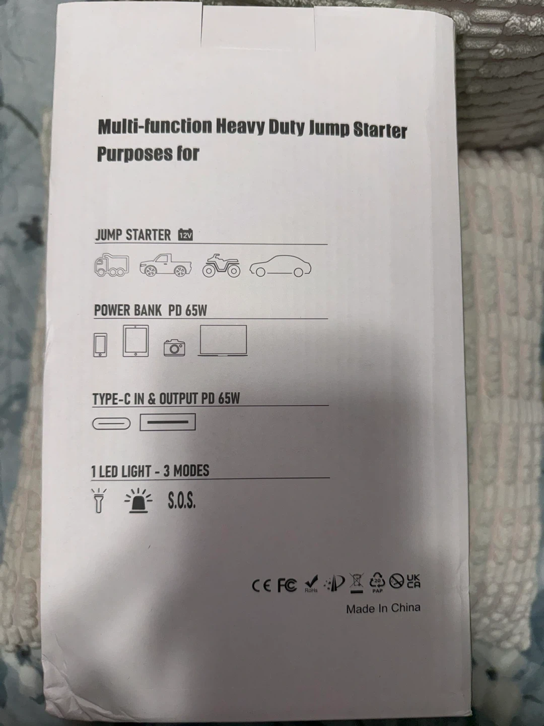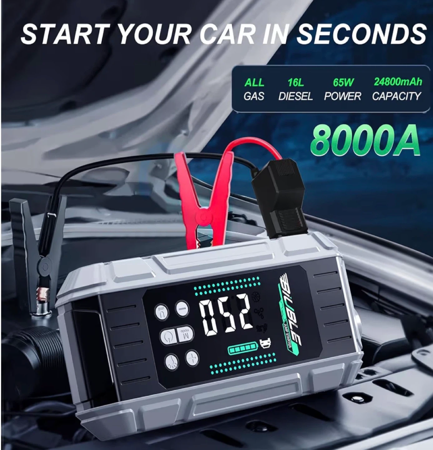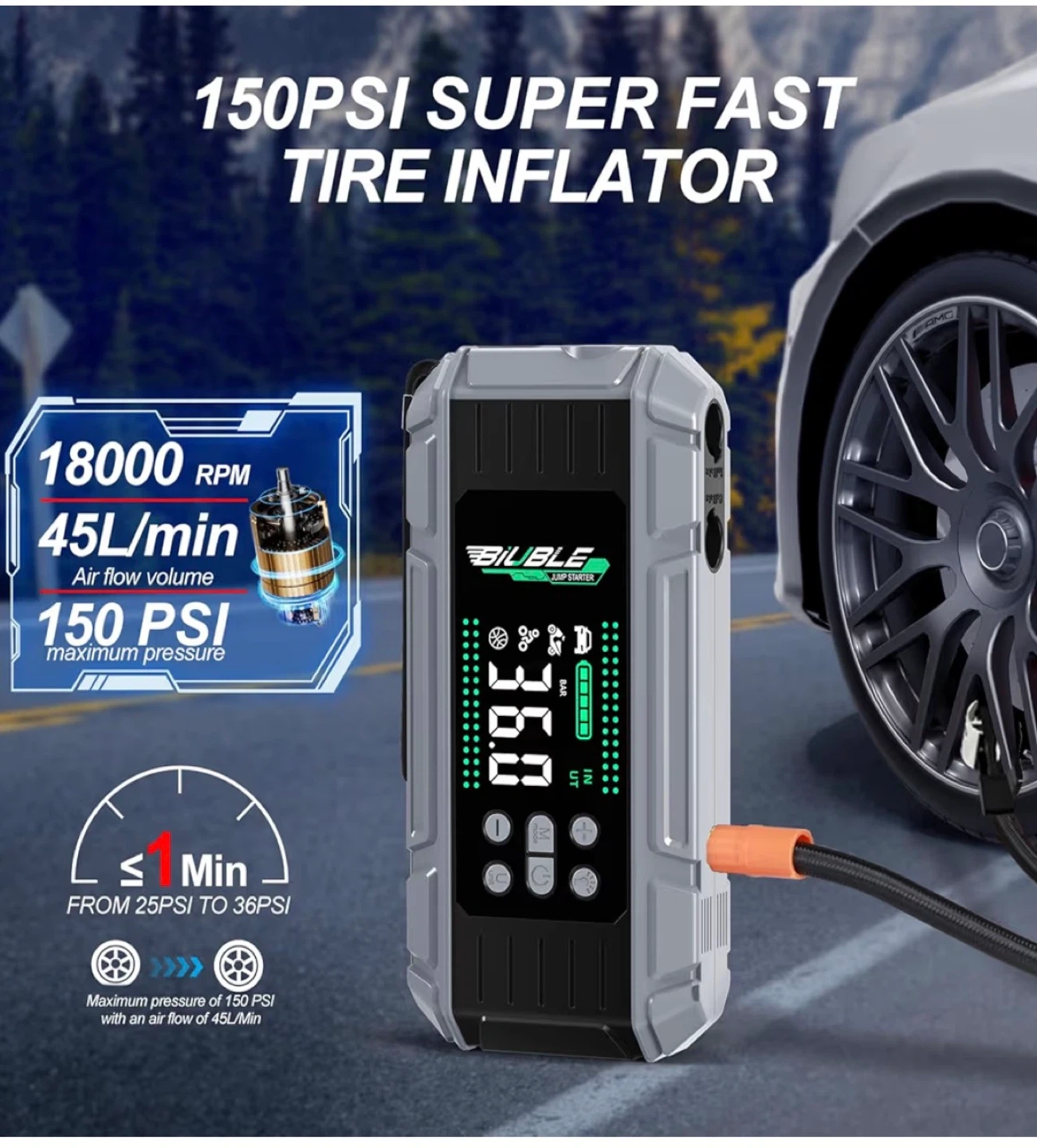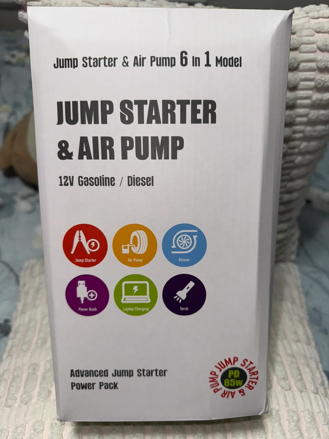 This is a multi-function jump starter and air pump for 12V gasoline/diesel engines. It also functions as a power bank with 65W PD, laptop charging, and a torch. The unit is rated for 150PSI and 10BAR pump pressure.