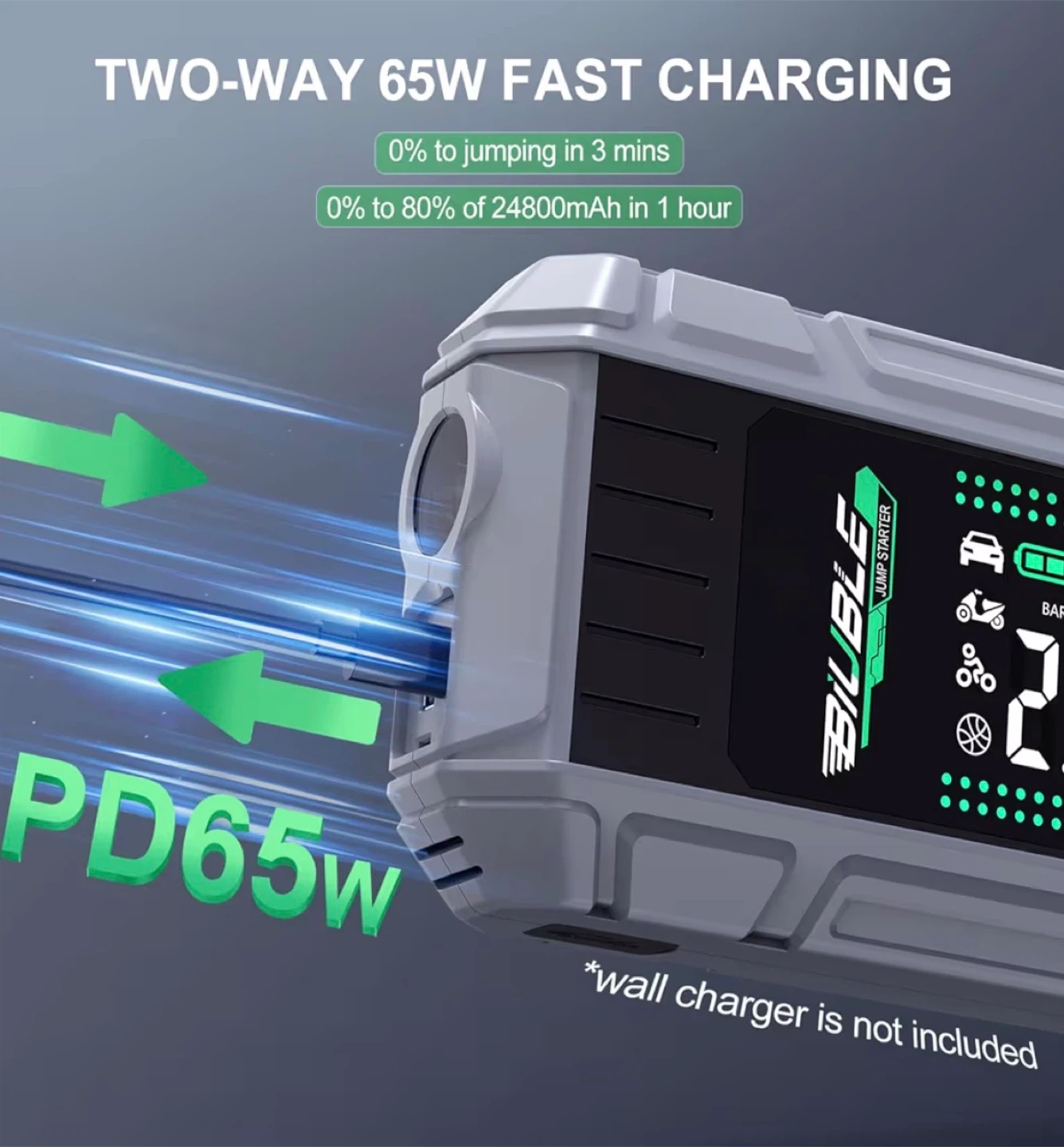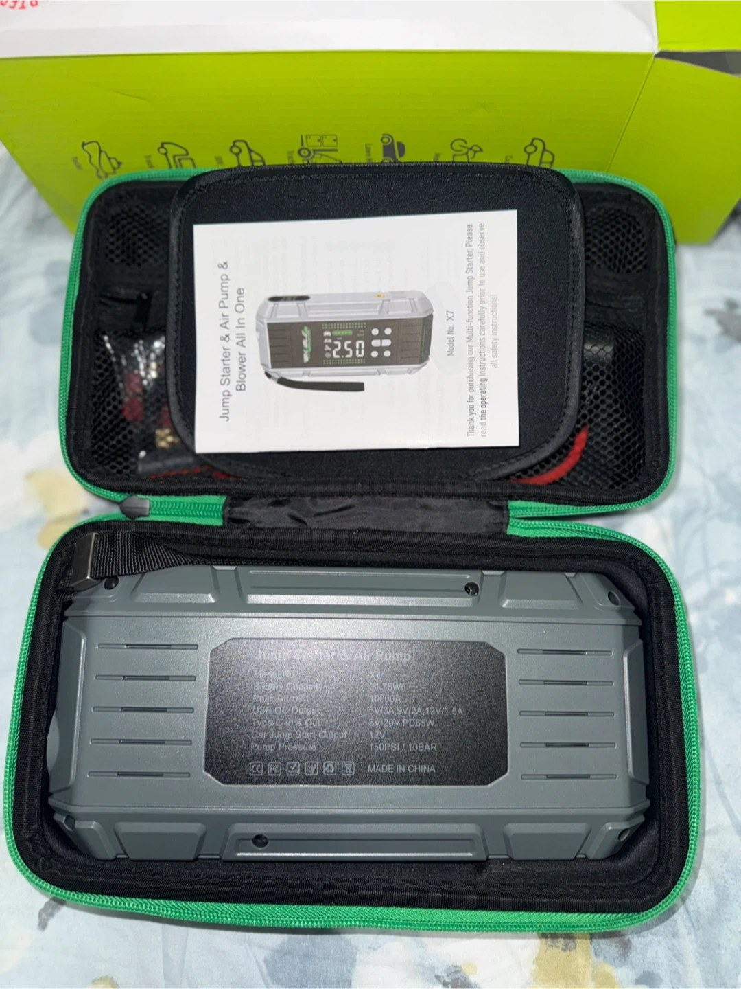 This is a multi-function jump starter and air pump for 12V gasoline/diesel engines. It also functions as a power bank with 65W PD, laptop charging, and a torch. The unit is rated for 150PSI and 10BAR pump pressure.