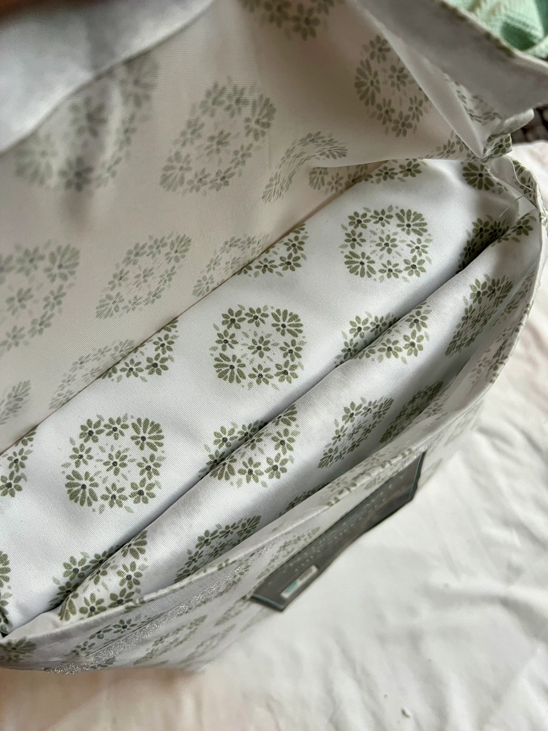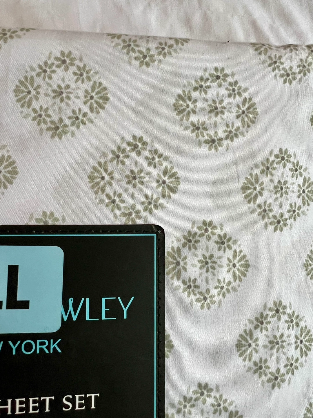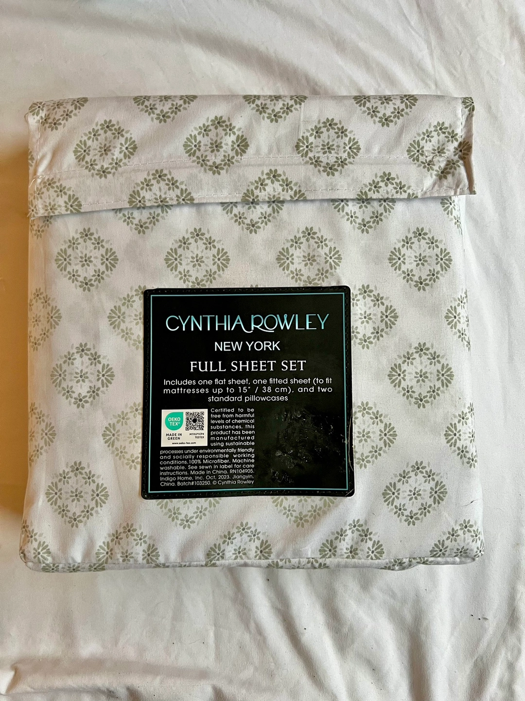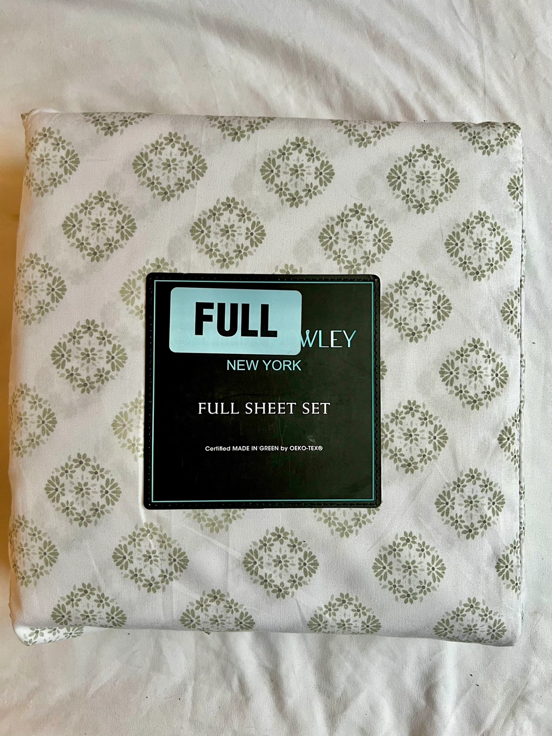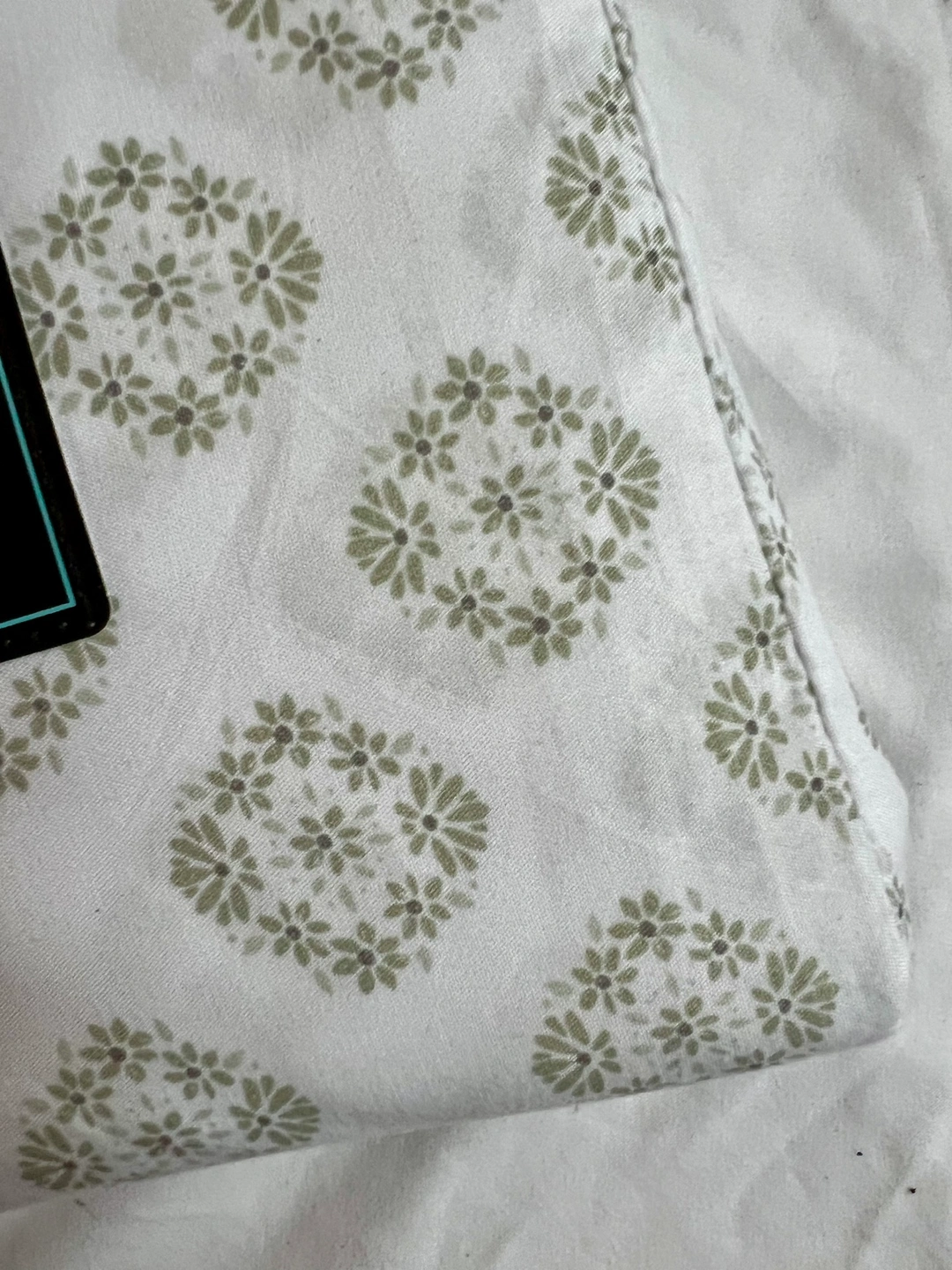 Full sheet set in green and white floral pattern. Includes one flat sheet, one fitted sheet, and two standard pillowcases. Made in China. Certified Made in Green by OEKO-TEX®