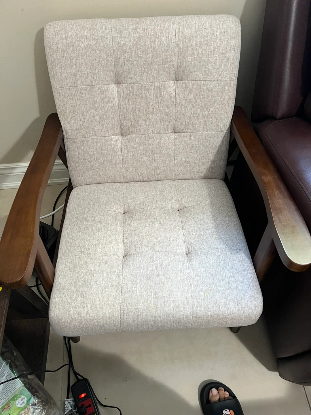Selling a comfy upholstered accent chair! It's in great shape and features stylish wooden arms. Perfect for adding a touch of cozy to any room in your home
