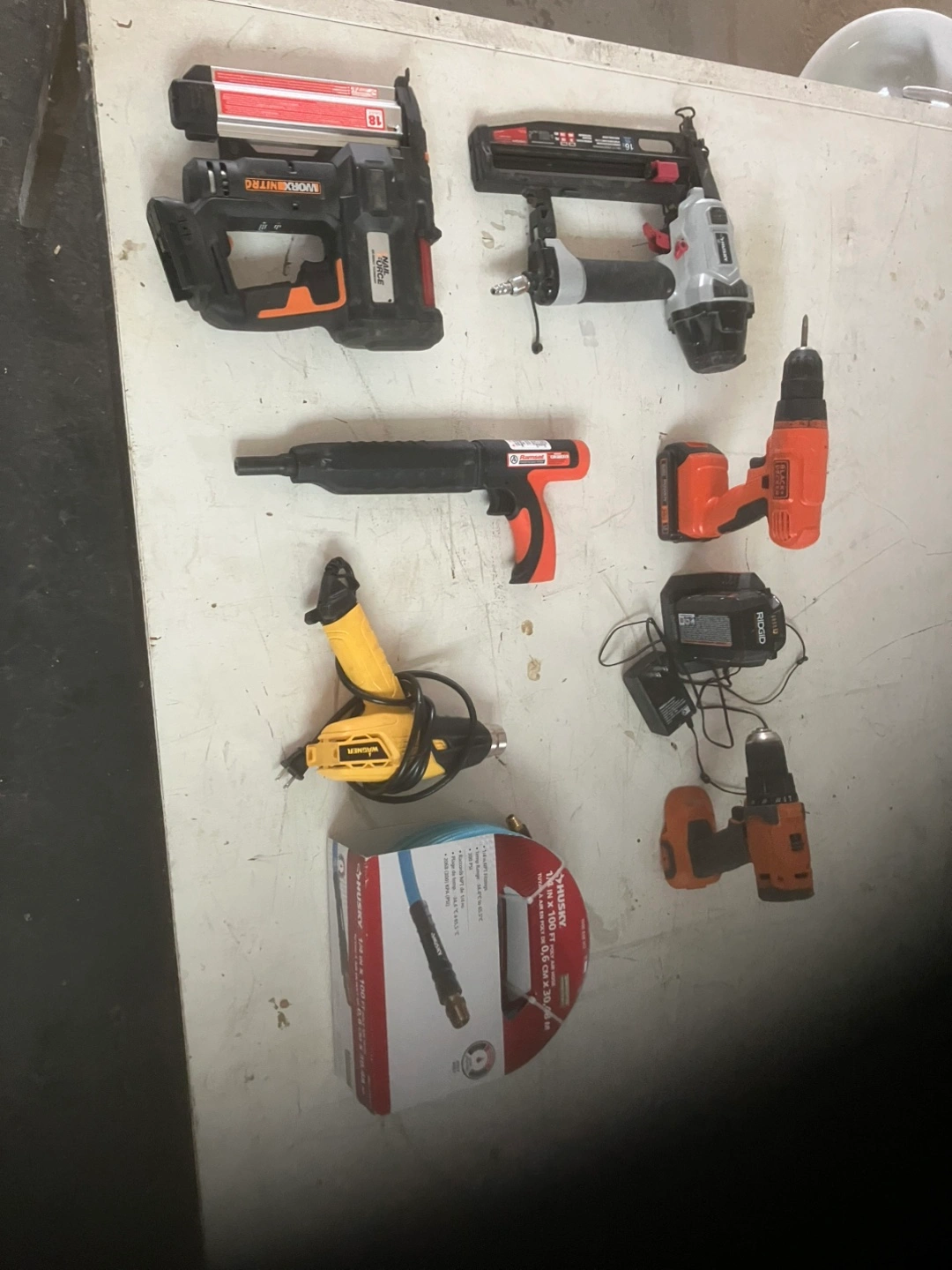 I have a variety of power tools for sale, including a Workx Nitro nail gun, a Ridgid drill, and a Husky air hose. They're all in used condition. The Husky air hose is 1/4 inch x 100