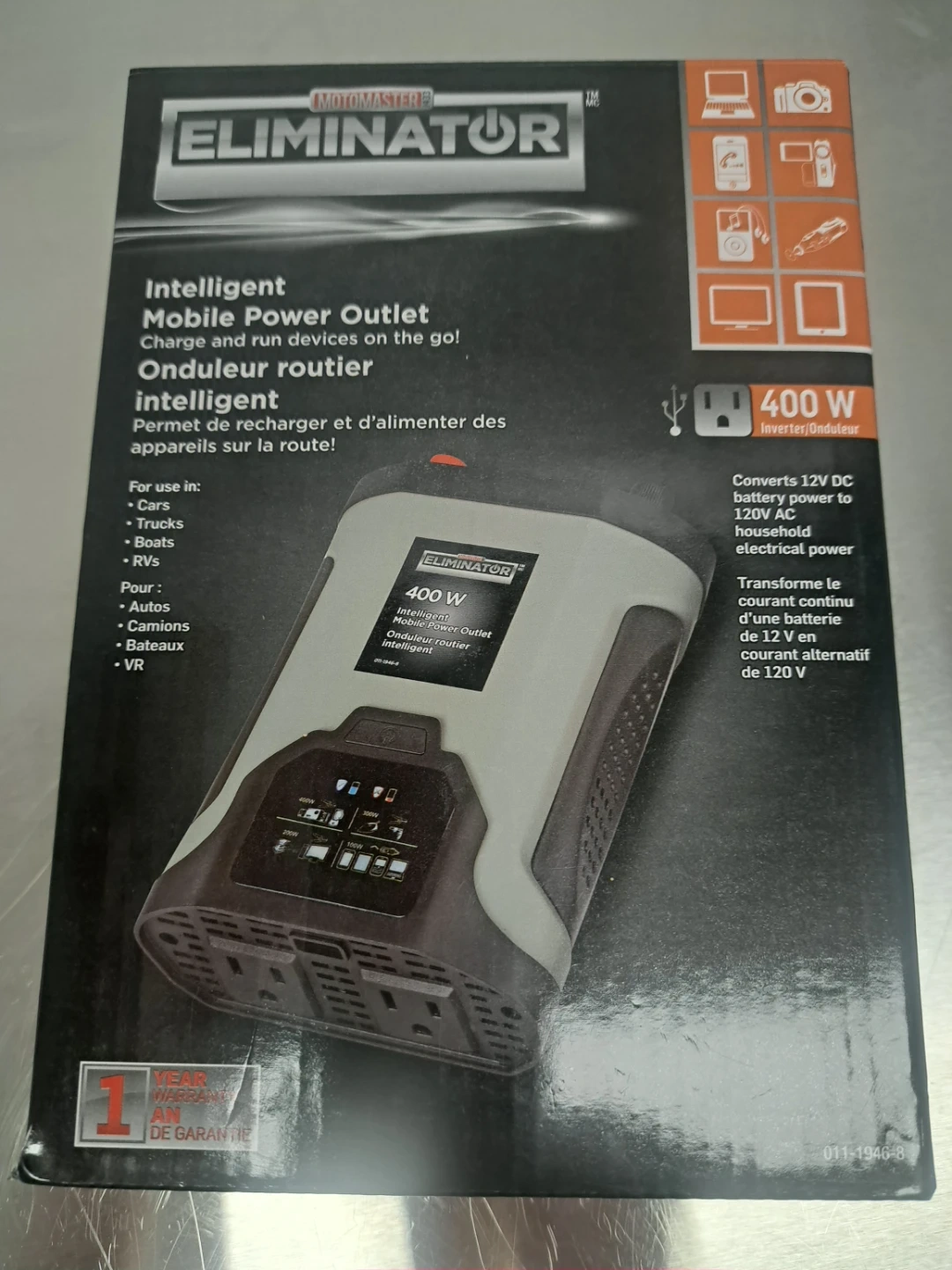Selling an Motomaster Eliminator 400W Intelligent Mobile Power Outlet. It's in like-new condition and includes the original box. This power outlet is perfect for charging and running devices on the go, whether you're in a car, truck, boat, or RV. It converts 12V DC battery power to 120V AC household electrical power. Comes with all the necessary cables and accessories!