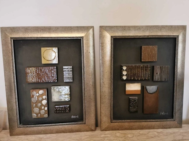 Add a touch of artistic flair to your living space with these unique Helena art pieces! These framed artworks feature textured squares in a variety of complementary earth tone colours, making them a great addition to any room. Please note that these are used items, showcasing their artistic character. Artist: Helena Style: Abstract/Modern Medium: Mixed Media Frame: Included. If the ad is up, it's available for pickup!