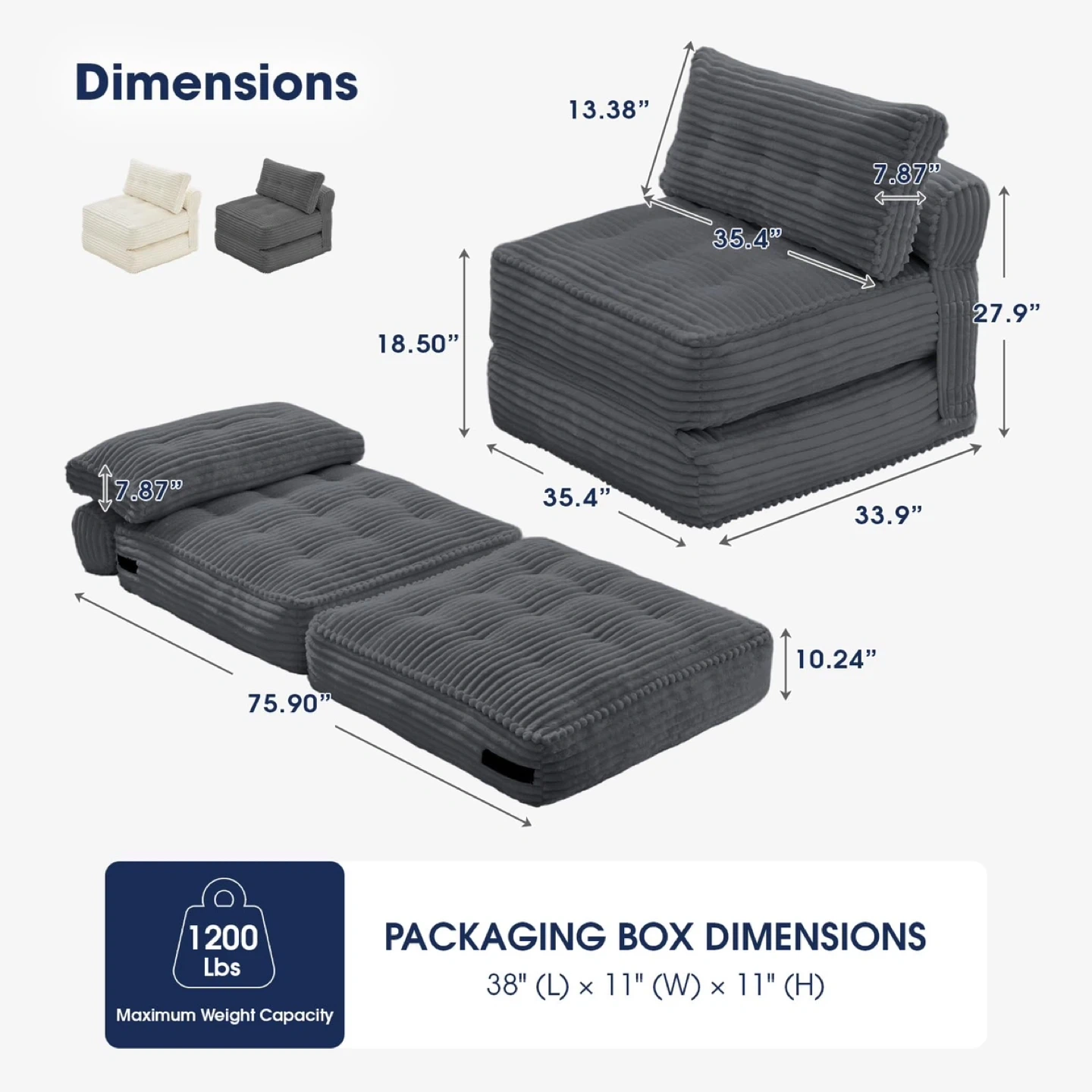 Spacious desing fit for adults:Maximize your comfort space! In chair mode, the folding sofa chair measures a compact33.9" L x 35.4" W x 27.9" H. Effortlessly unfolds into a generous sleeping surface at 75.9"L x 35.4"W x 7.9"H, comfortably accommodating most adults whether sitting, lounging, or sleeping soundly.