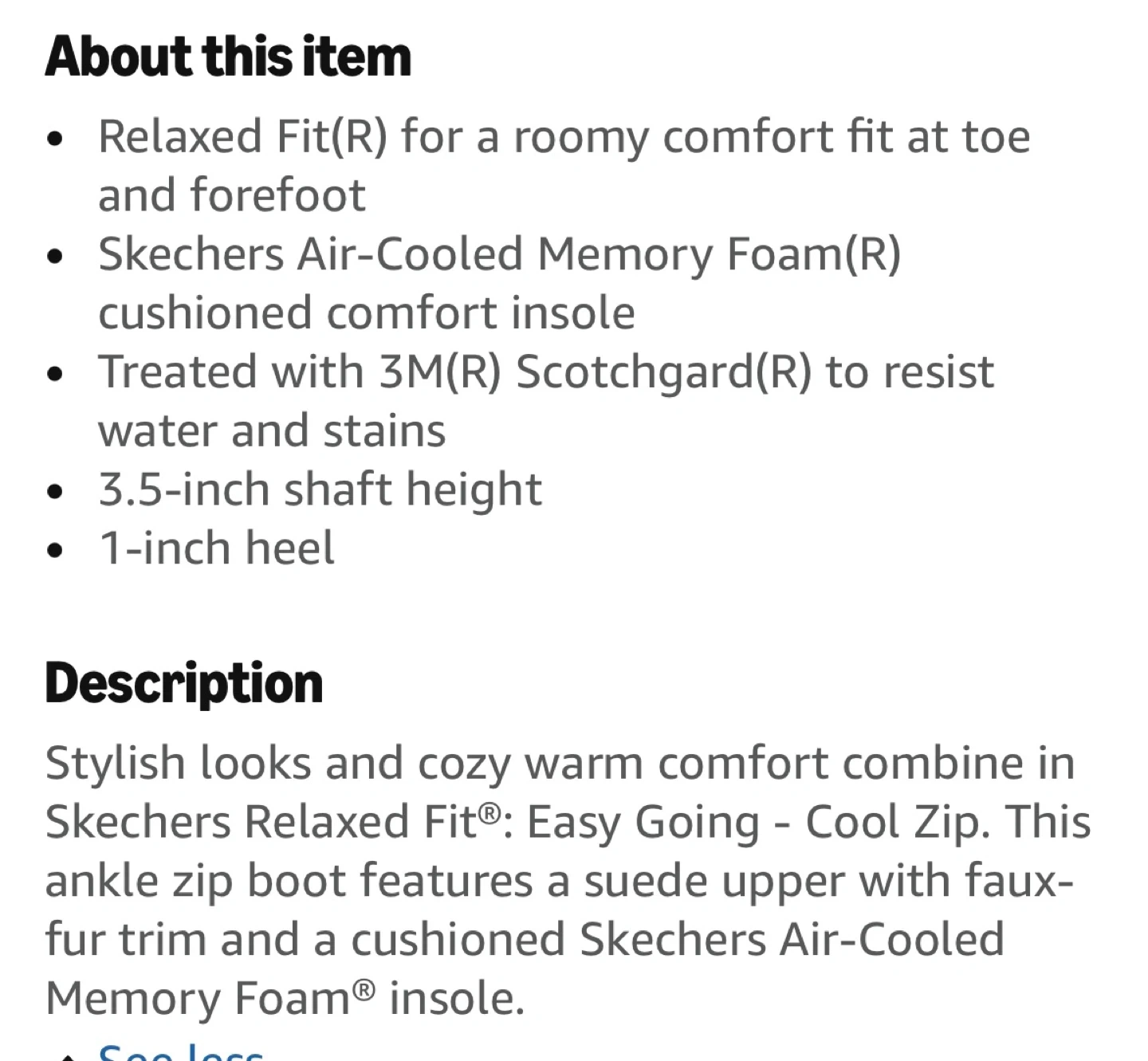 These Skechers boots feature a faux fur upper and lining with a relaxed fit. They're made with leather and man-made materials and have Air-Cooled Memory Foam insoles. Easy zip-up closure.