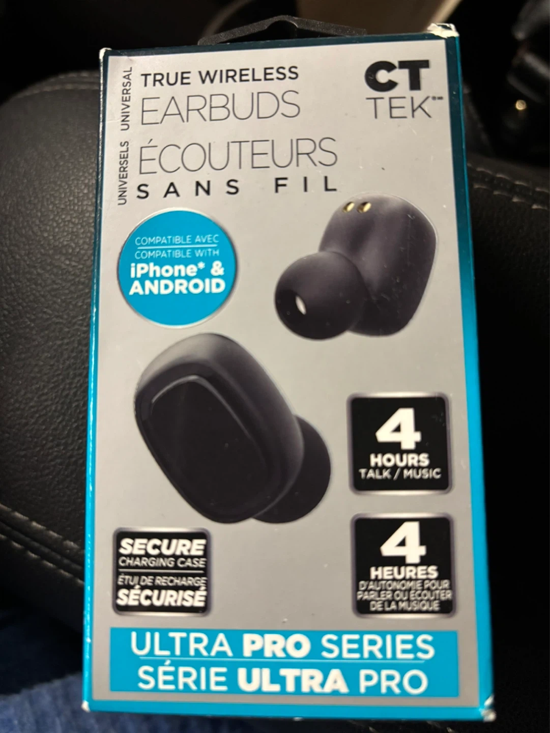 These CT Tek true wireless earbuds come with a carrying case and charger. They offer touch controls, a built-in mic for hands-free calling, and 4 hours of play time. The operating range is 10 meters.
