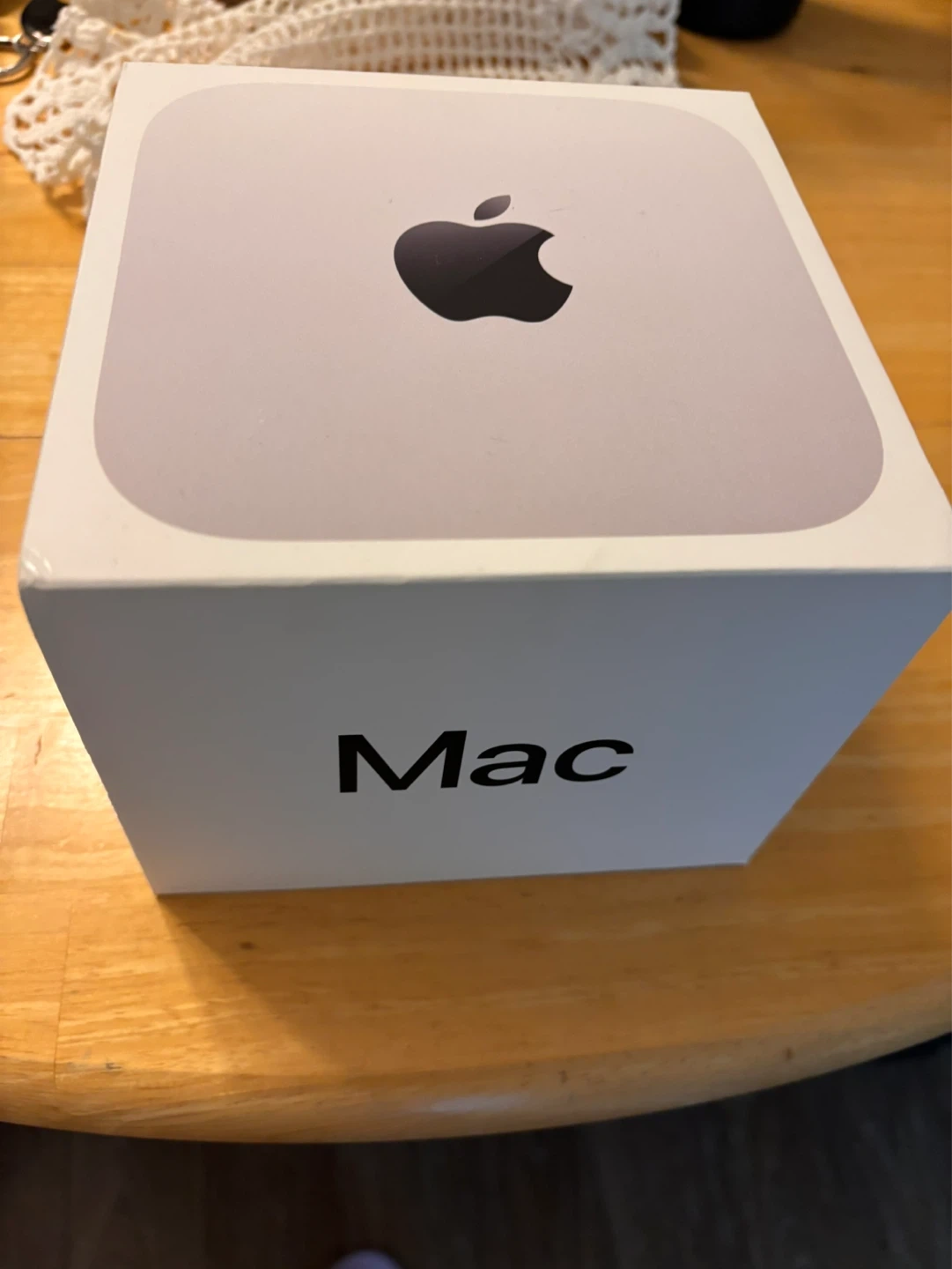 Compact silver Mac Mini desktop computer M4 chip. It includes the main unit and its power cable. Original box is also included, making it great for setup or storage!