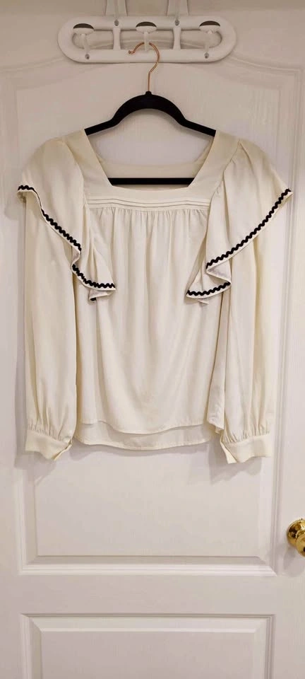 Cute cream blouse. Square neck with pretty ruffles on shoulders. Black rickrack trim on the ruffles. Long sleeves with cuffs. Super comfy and flowy.
