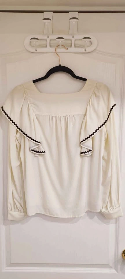 Cute cream blouse. Square neck with pretty ruffles on shoulders. Black rickrack trim on the ruffles. Long sleeves with cuffs. Super comfy and flowy.