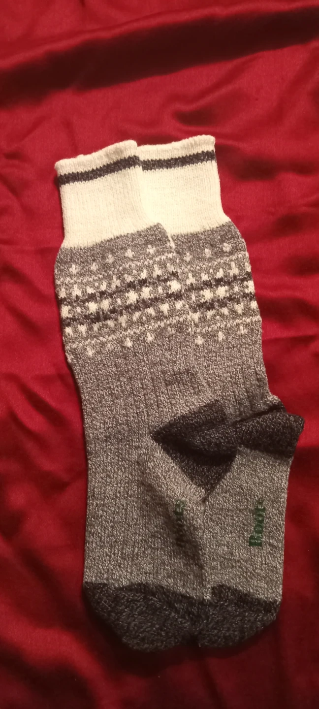 A pair of Roots crew socks in a grey marled knit with a patterned cuff. Features the Roots logo embroidered on the heel. Soft and warm for everyday wear.