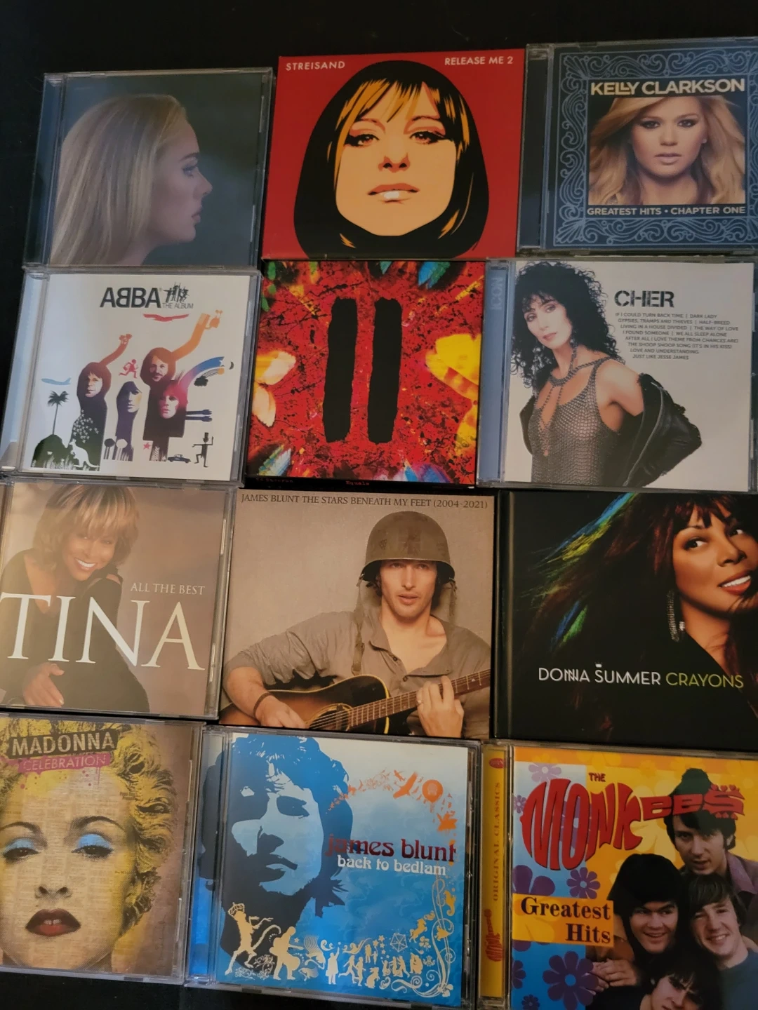 This is a collection of ten music CDs. It includes artists like Adele, ABBA, Barbra Streisand, Kelly Clarkson, Cher, Tina Turner, James Blunt, Donna Summer, Madonna, and The Monkees. Most appear to be greatest hits albums or compilations. They're great for any music lover's collection!