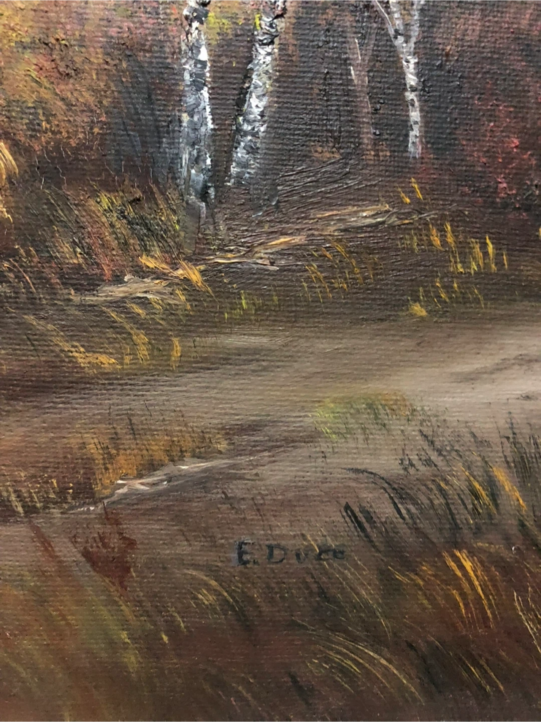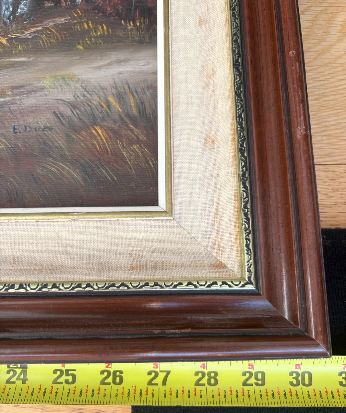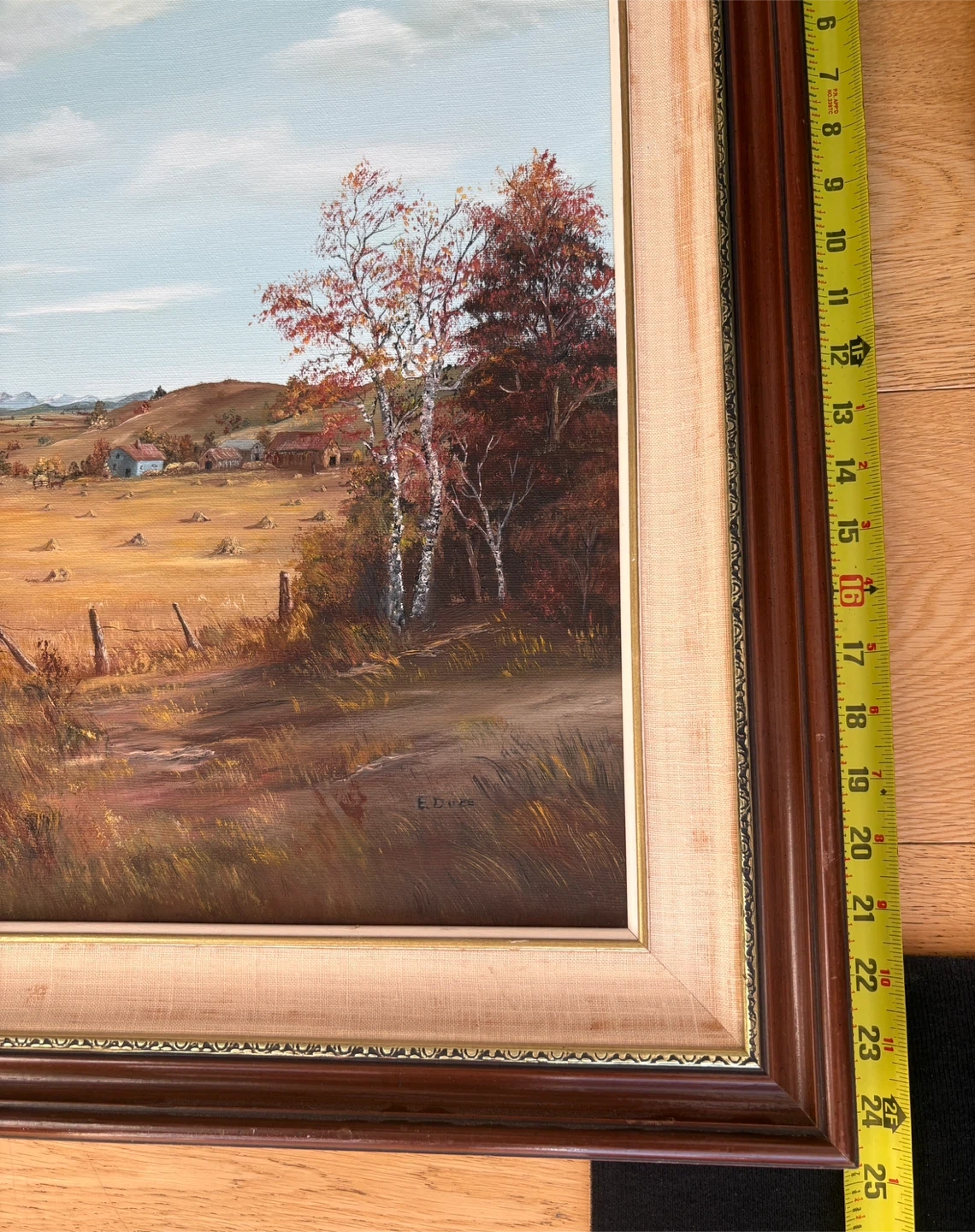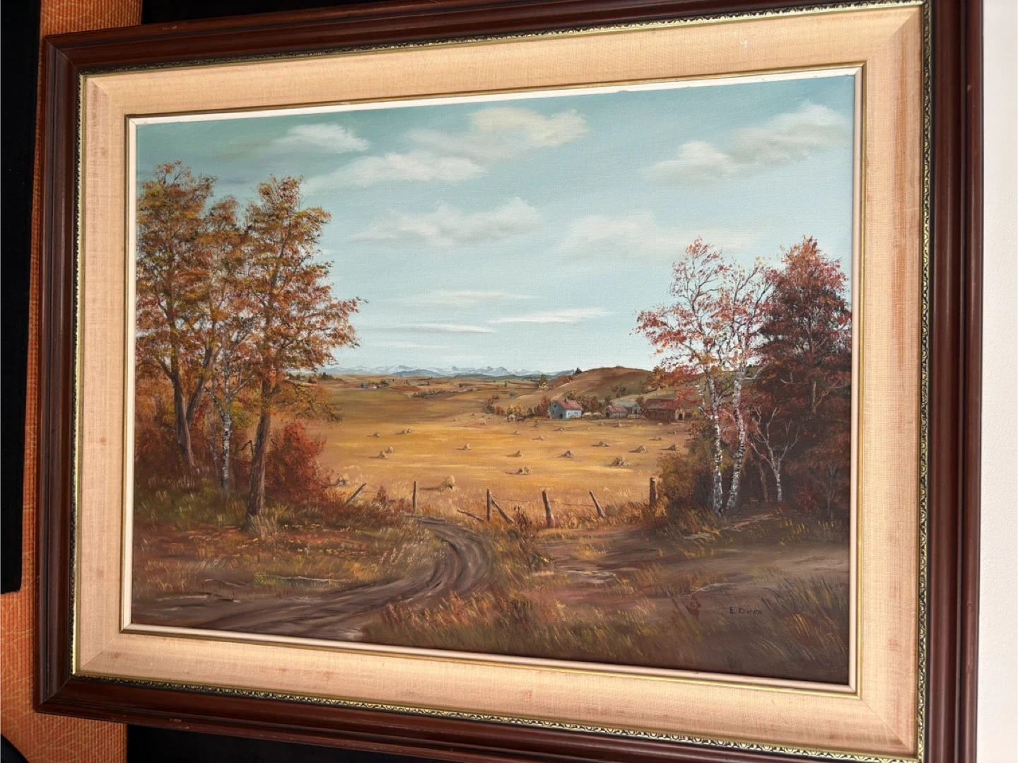 Vintage Oil Painting by Alberta Artist Edna Duce depicting a rural prairie landscape scene. It's signed by the artist E. Duce and comes in a wooden frame.
