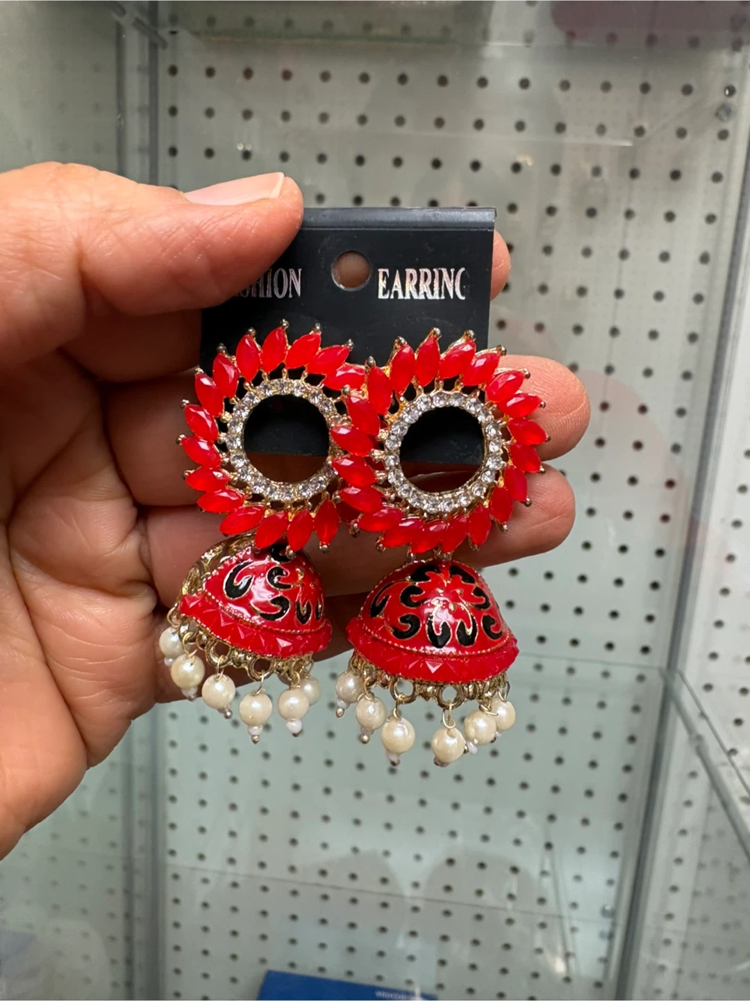 These Dhwani earrings feature intricate designs with beads and pearls. They're available in a variety of vibrant colours and styles. Perfect for adding a touch of elegance to any outfit! each 5$