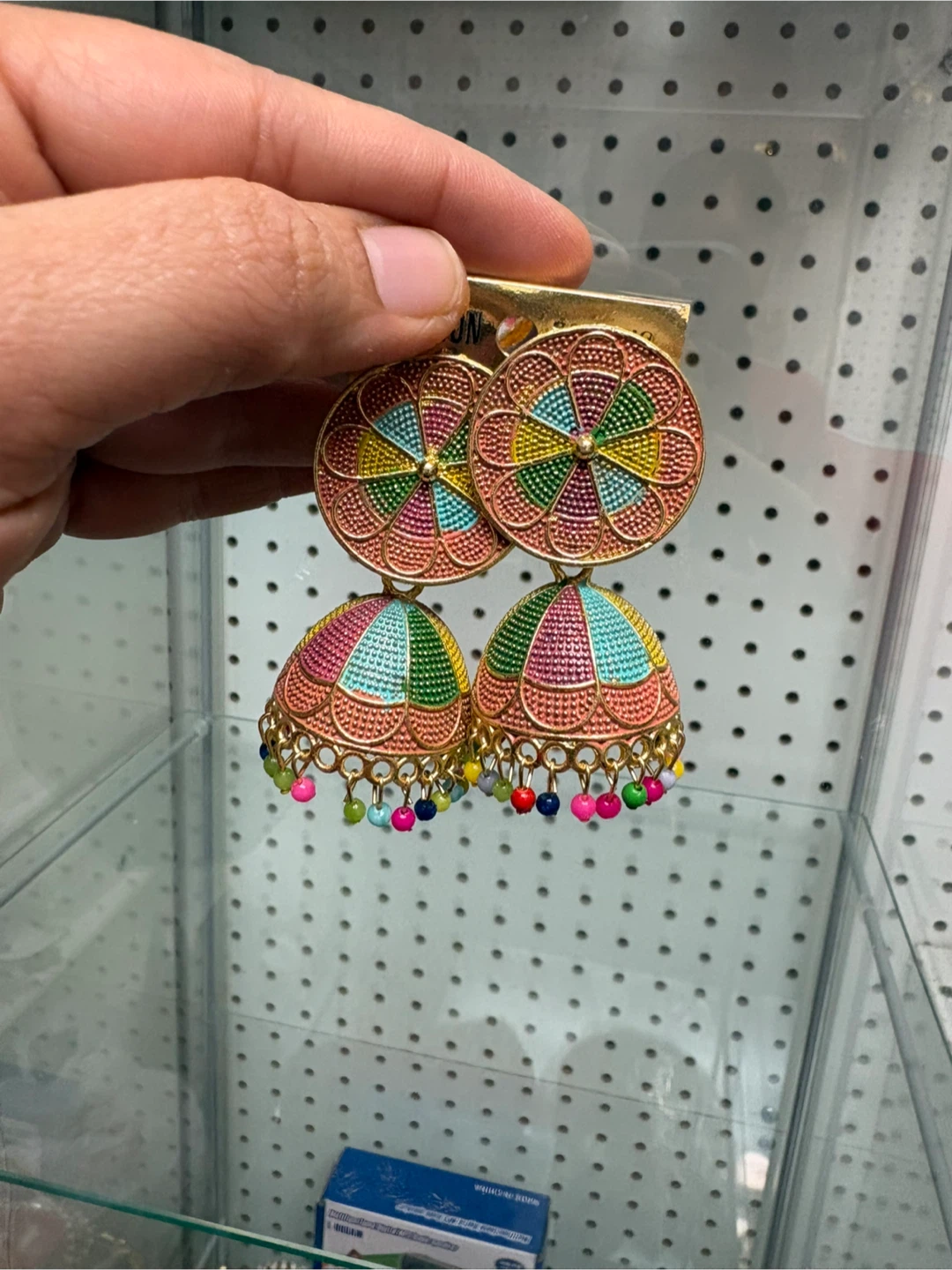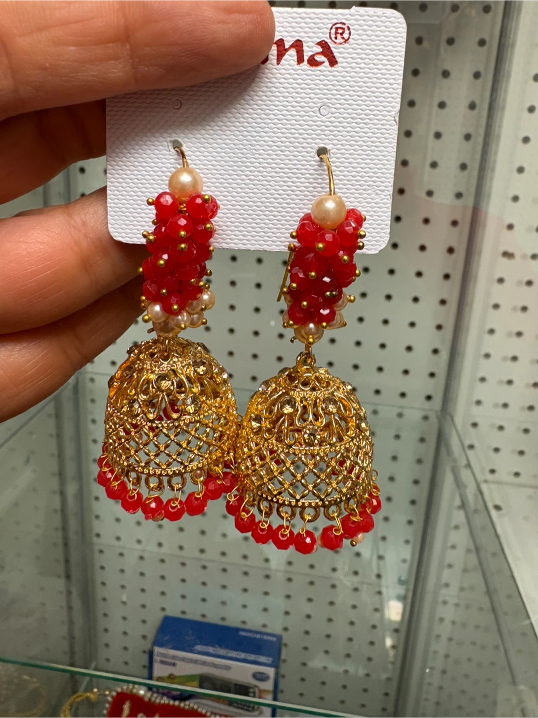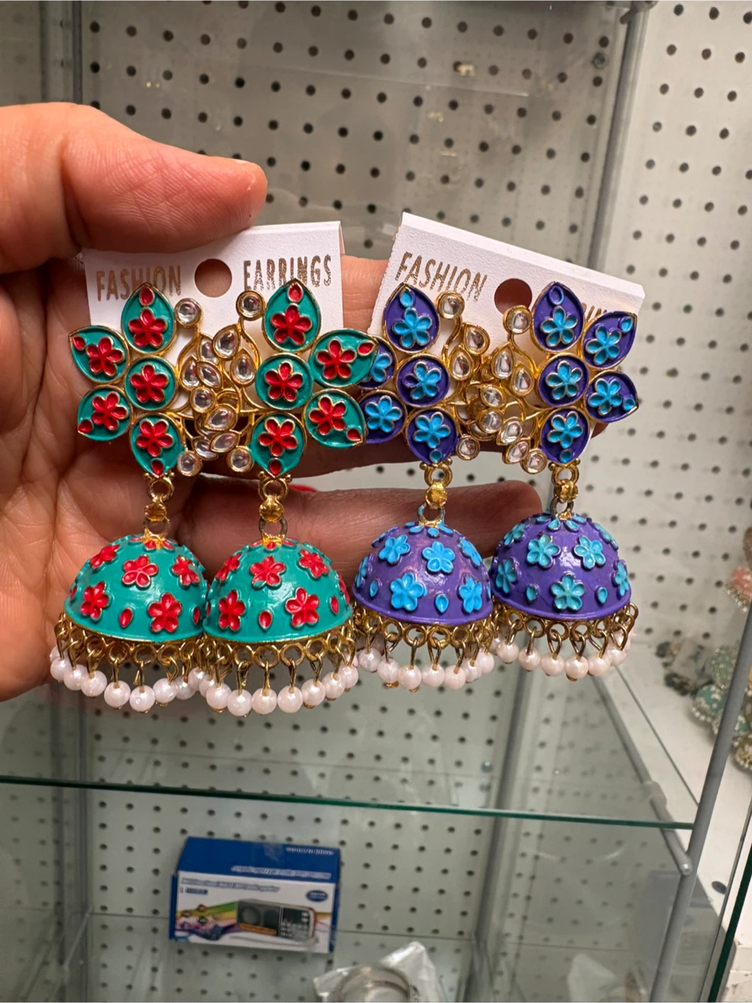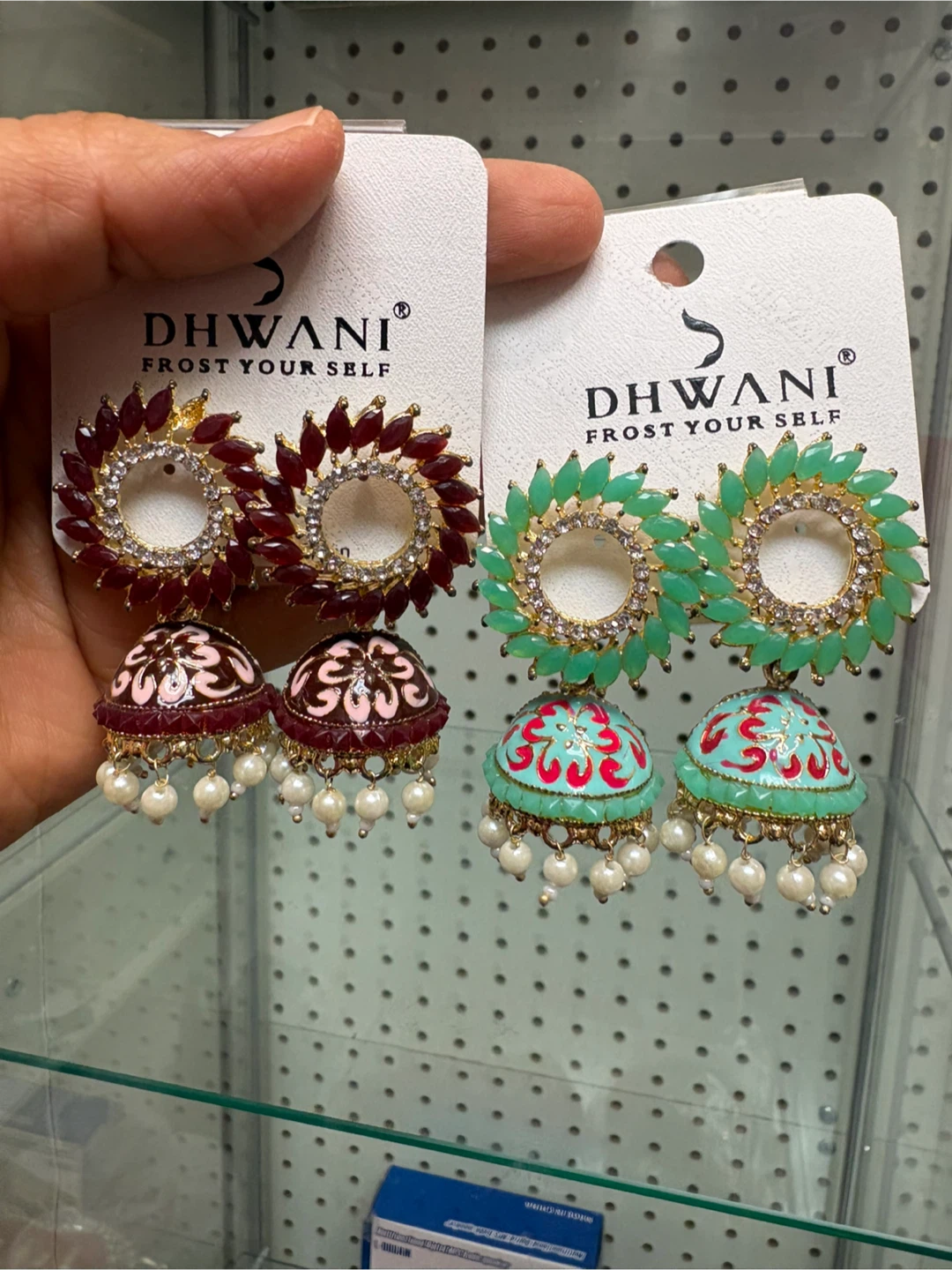 These Dhwani earrings feature intricate designs with beads and pearls. They're available in a variety of vibrant colours and styles. Perfect for adding a touch of elegance to any outfit! each 5$