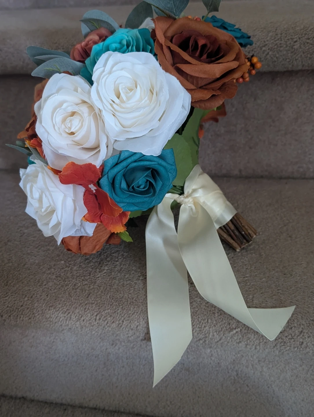 This beautiful artificial flower bouquet features a mix of teal, rust, and white roses with eucalyptus accents. It's finished with a cream ribbon and a rustic stem wrap. Perfect for a wedding or decorative accent! Was not used!