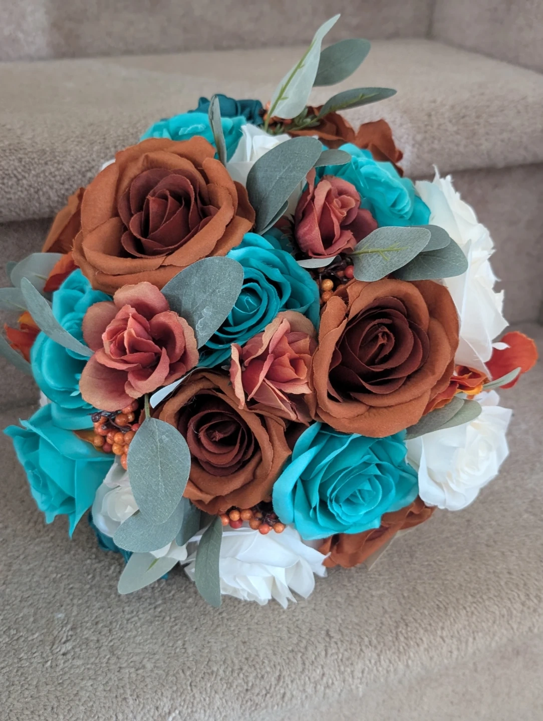 Artificial Flower Bouquet - Teal, Rust, and White Roses π₯