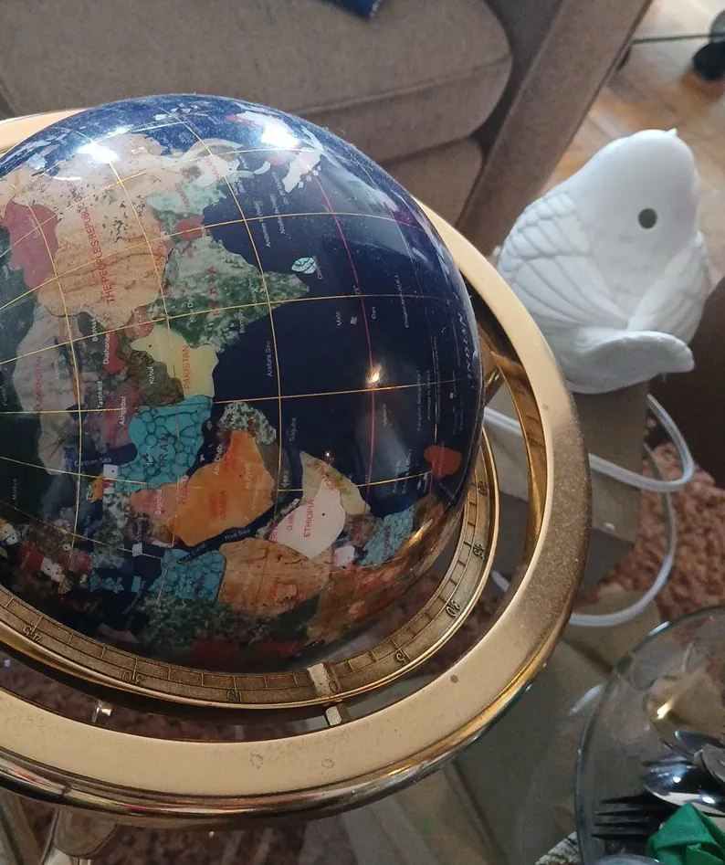 Globe on a brass stand. Globe has coloured stone detailing and a dark blue background. Perfect for anyone who loves to travel or dream of adventure. $15