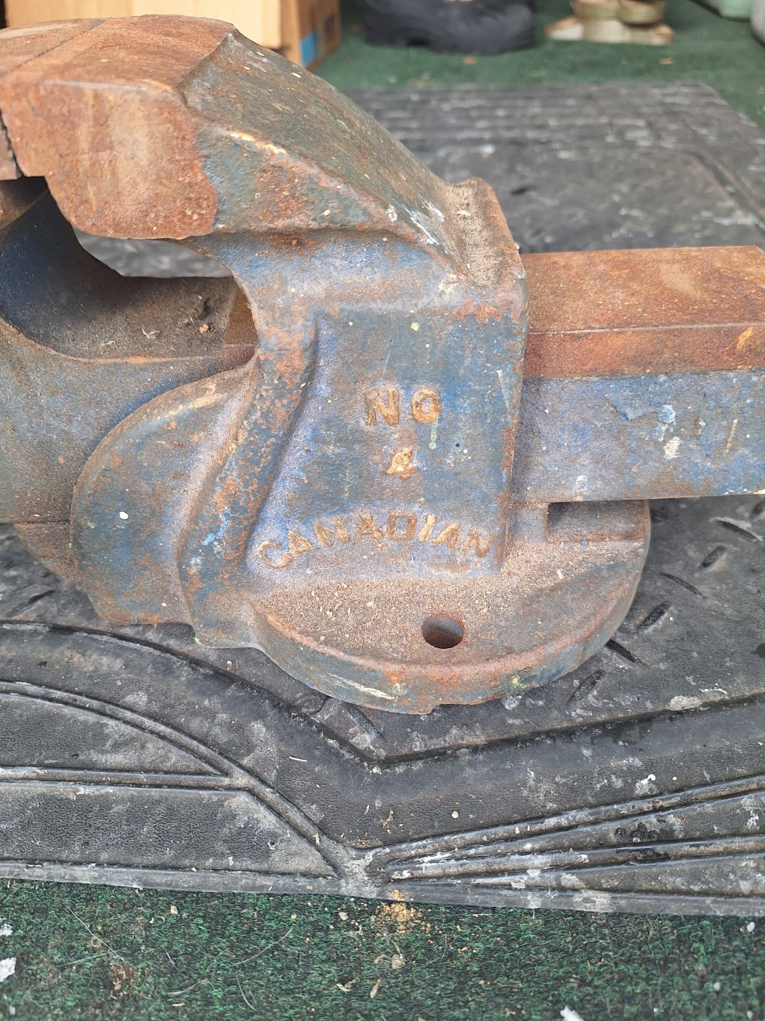 This is a vintage Canadian-made bench vise. It's heavy-duty cast iron construction and features a swivel base. Shows signs of rust and wear consistent with age, but the mechanisms still function. Two for sale $50 each